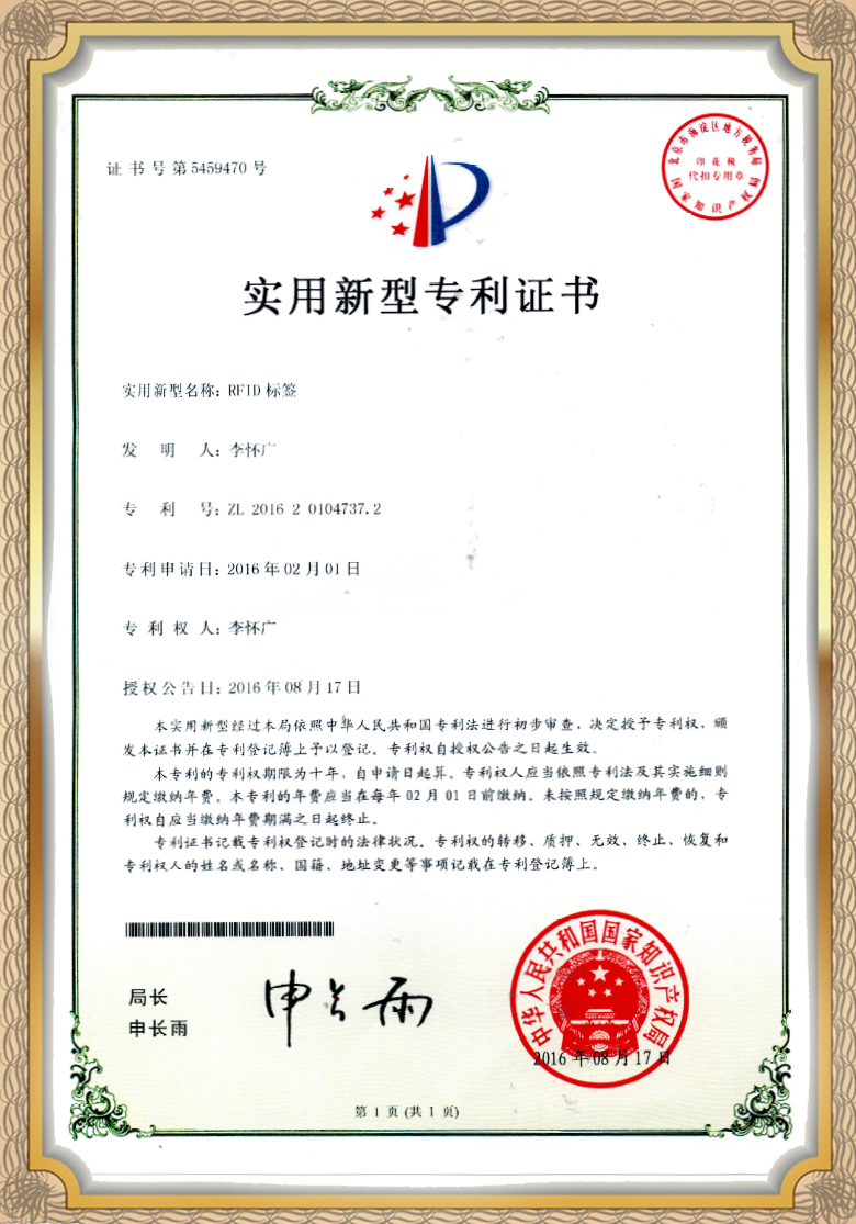 新型实用科技专利证书