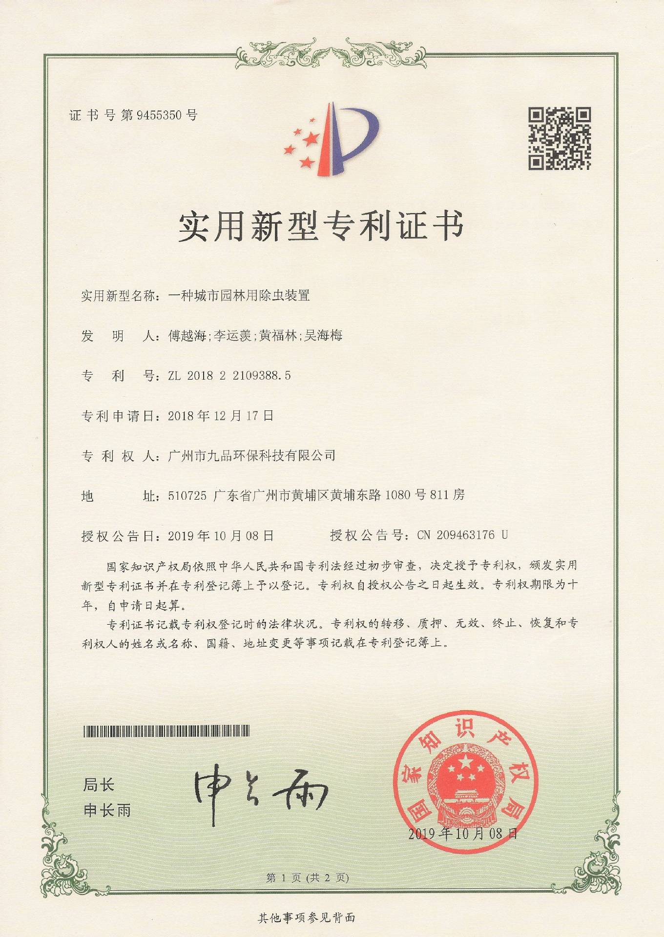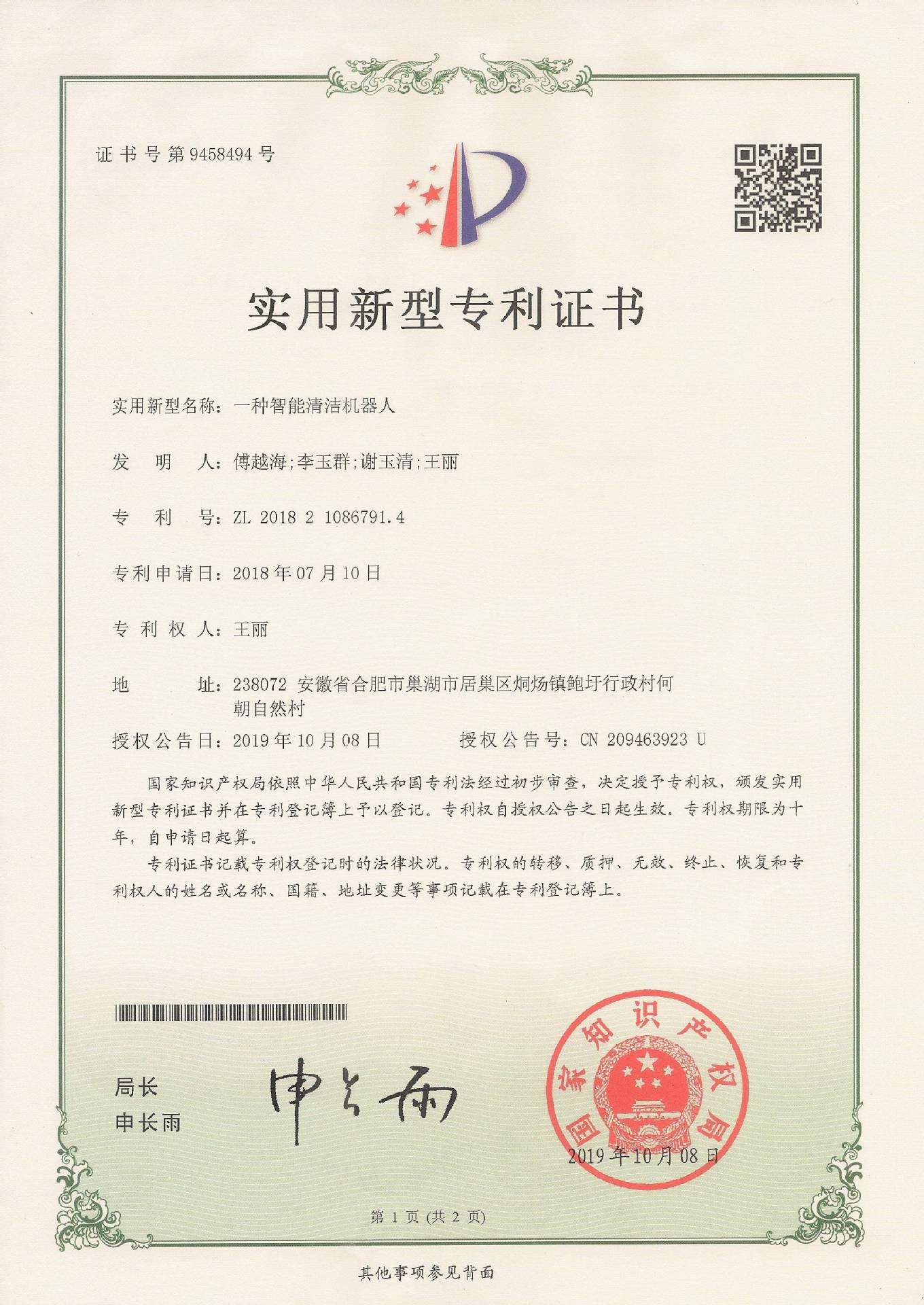 持有专利证书