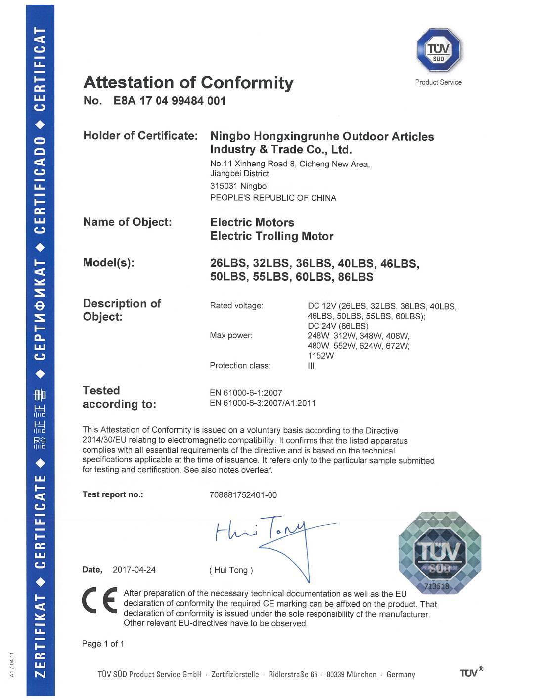 公司简介 宏兴公司成立于2014年4月,注册资金200万 ,是宁波市一家专业生产制造户外休闲运动用品(电动挂桨机)的公司,集研发、生产和销售于一体的新型独资公司。坐落于宁波以北,杭州湾大桥以南的连接段...