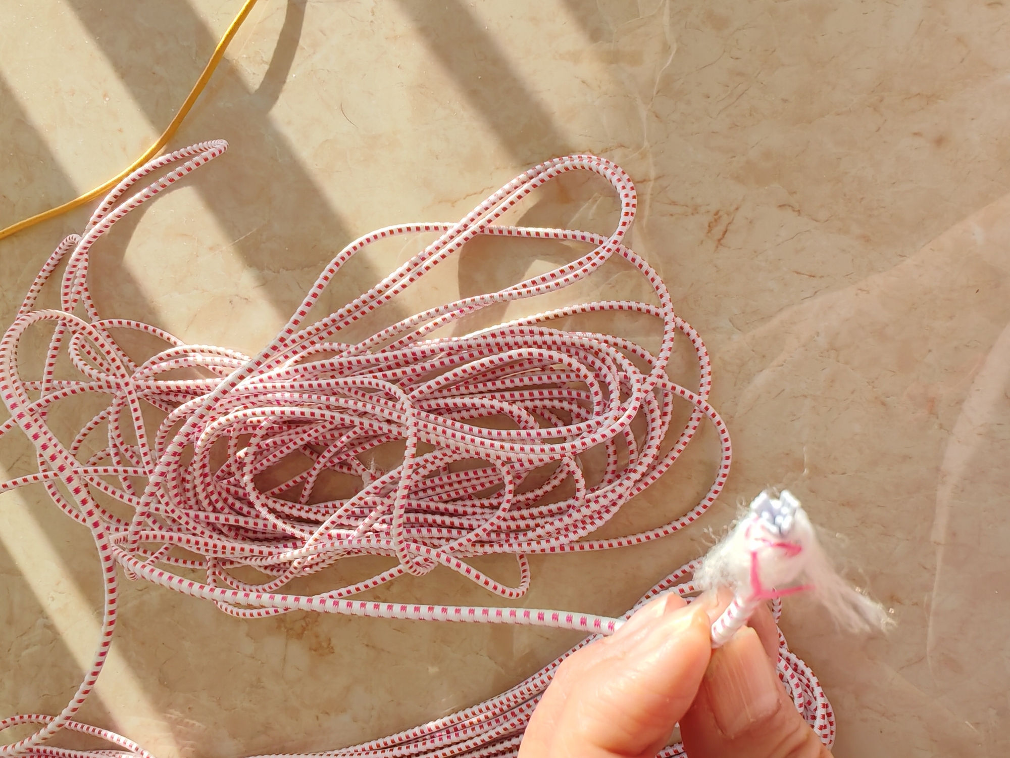 松紧带不粗但弹性可以。100米共10卷,每卷中间无额外断口接口,完完整整一根长,多芯,非常好。很诚信的店家。2024.12.2