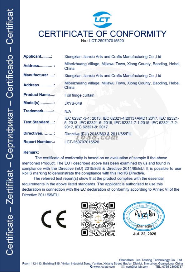 本厂是雨丝帘,方块帘,桌布,吊坠挂件,圣诞礼品等其他派对用品专注生产加工的工厂,拥有完整科学质量管理体系。公司产品远销南美,欧美,东南亚等国家。