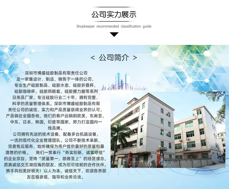 深圳市博盛硅胶制品有限责任公司是一家集设计、制造、销售于一体的公司,专业生产硅胶制品、硅胶水壶、硅胶折叠杯,硅胶咖啡杯,硅胶雨鞋套,硅胶握力圈等系列日用品厂家,专注硅胶行业二十年,拥有完整、科学的质量...