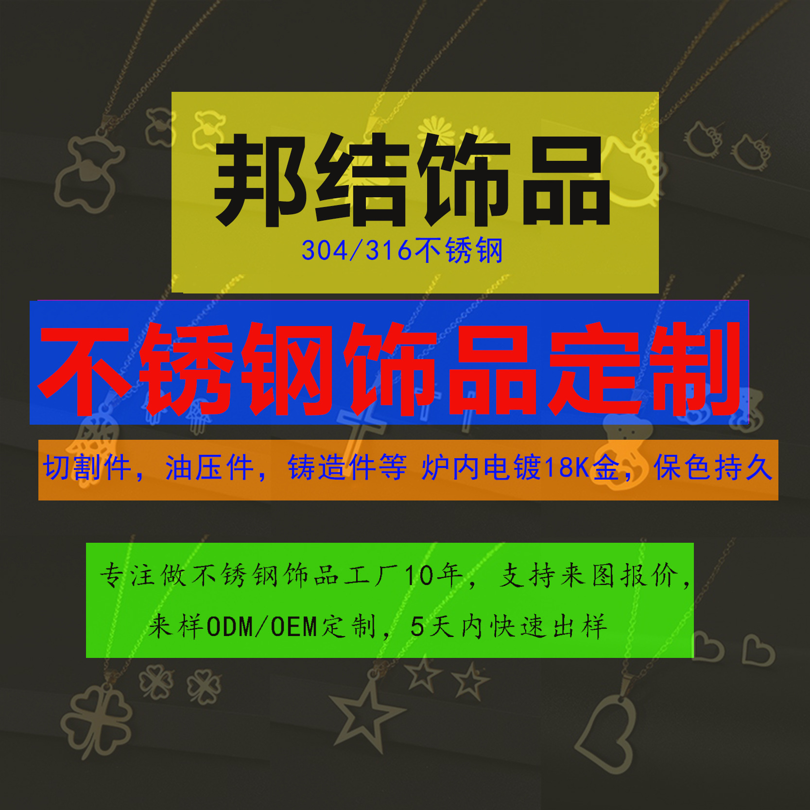 义乌市邦结饰品有限公司,自成立以来,始终致力于钛钢首饰的研发、生产和销售。作为业界的佼佼者,我们秉持“品质至上,客户为先”的经营理念,不断创新,追求卓越。 我们主要生产各类钛钢首饰,包括戒指、吊坠、耳...