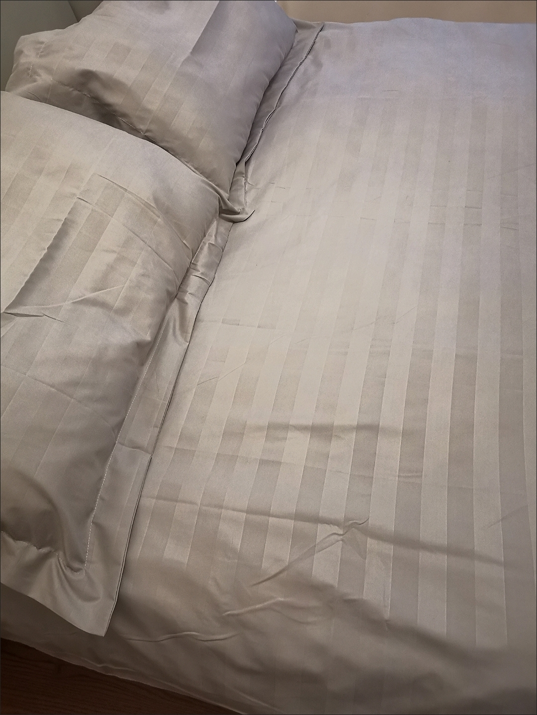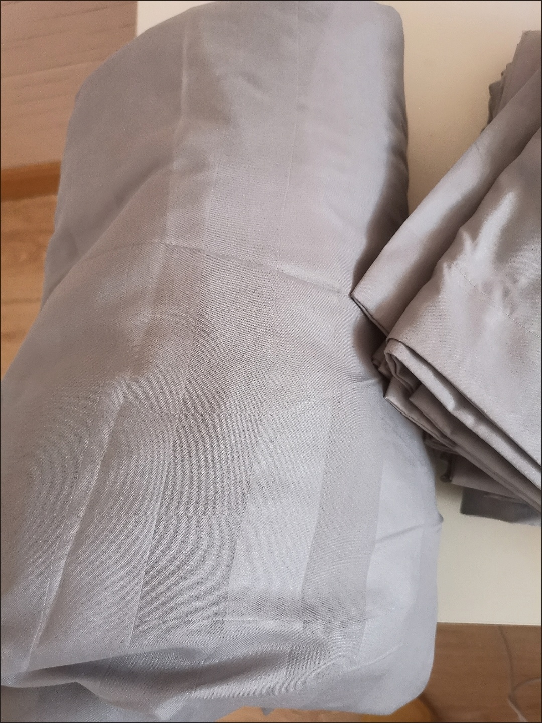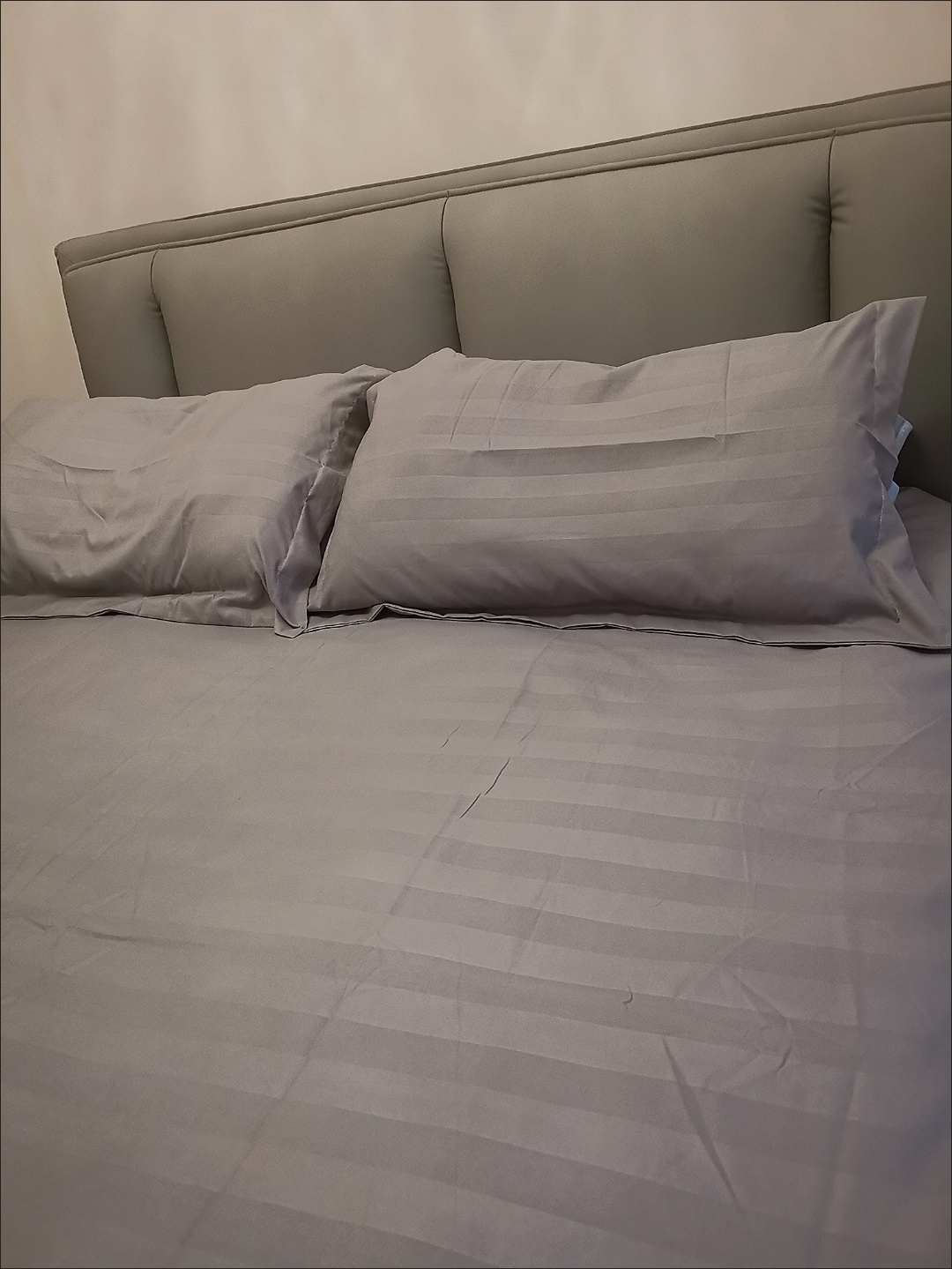 赞商家发货快。拍的灰色缎条四件套1.5米床款特别喜欢床笠款式,显得房间整洁清爽,酒店风灰色缎条,显高端大气易搭配,跟家里的窗帘色系一样搭配协调,四角有绑绳被套内有绑带,做工挺好,四件套的面料页面上有,如是纯棉哪怕价格高点就更完美,看中的是这款的颜色和款式。2025.7.4