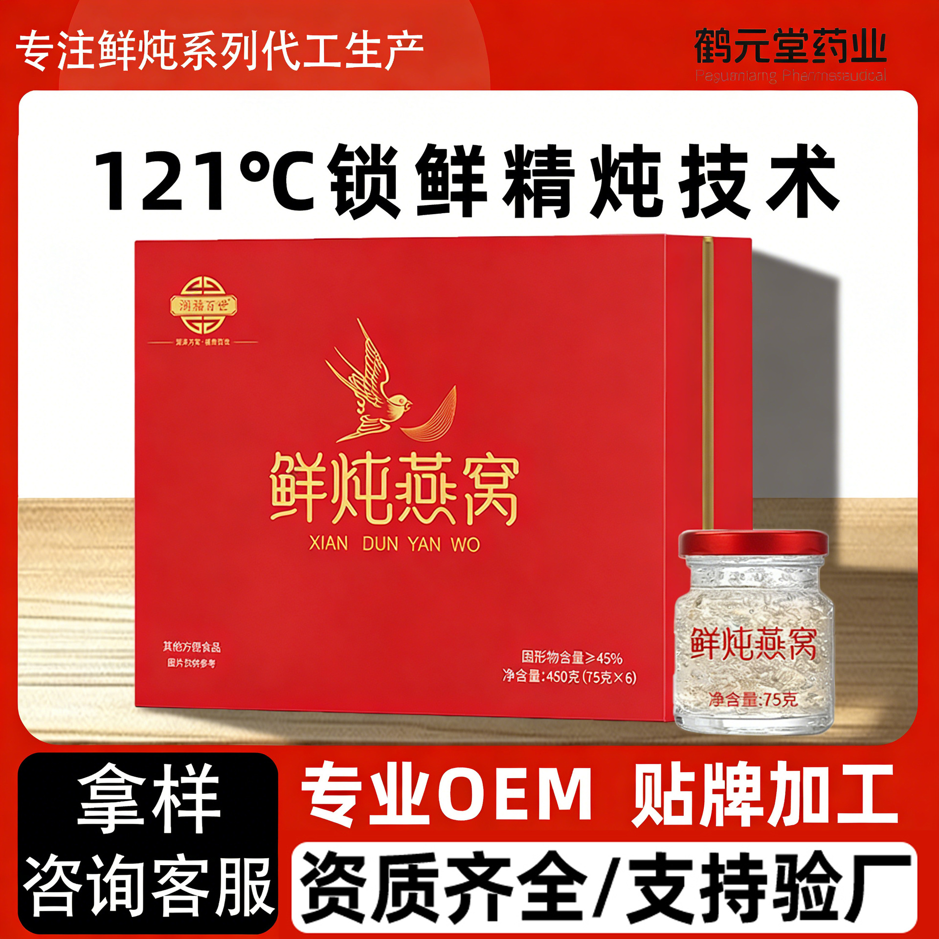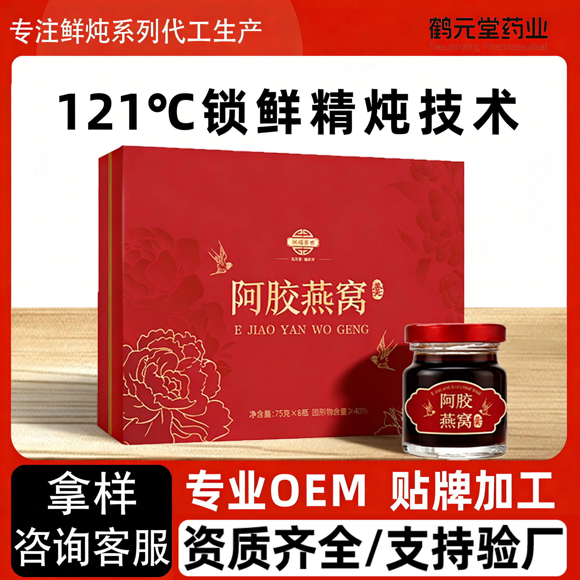 山东鹤元堂药业(山东)有限公司是一家专业生产即食花胶、花胶粥类、鲜炖燕窝、即食燕窝、燕窝粥、大健康饮品及燕窝衍生品等高 端滋补品的OEM代加工生产企业。我们始终立足于大健康产业专注滋补养生产品的研发和...
