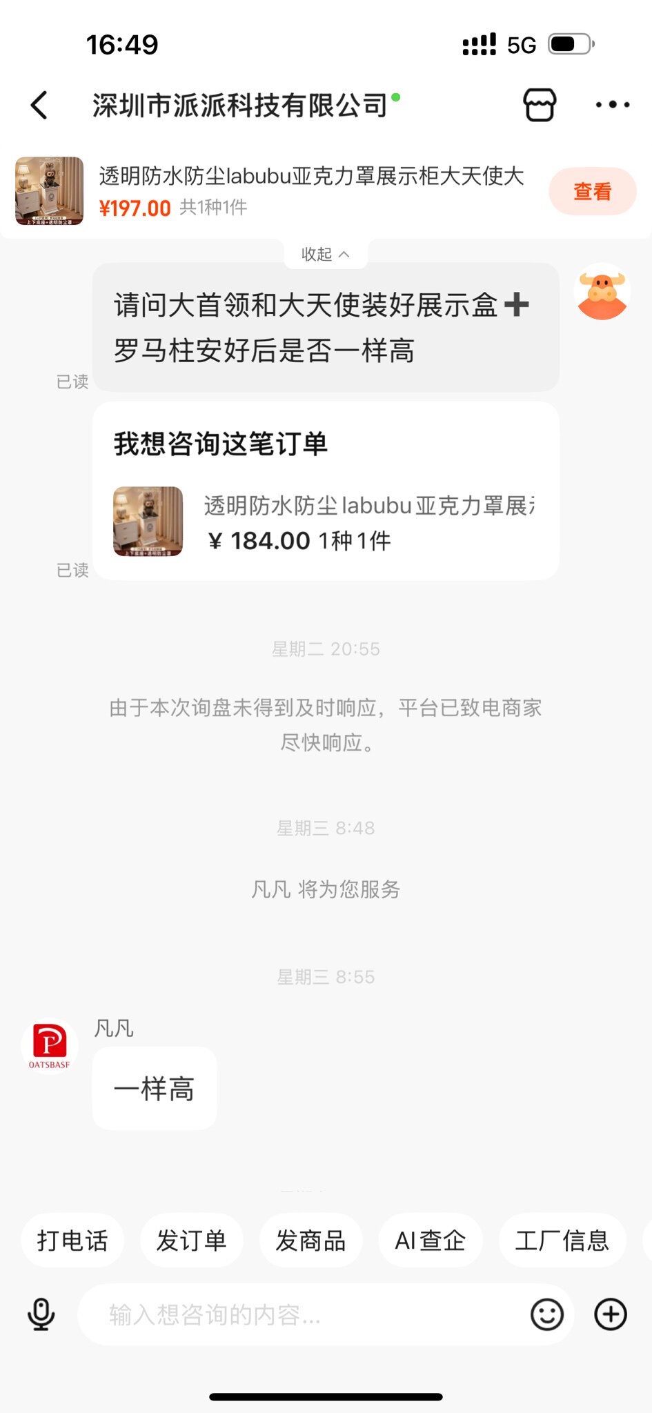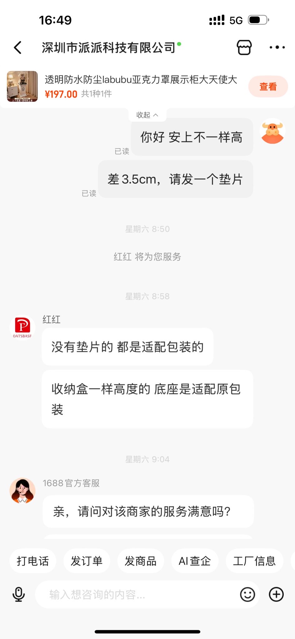 核心问题在于客服的专业与态度。售前我主动确认“大天使和大首领罗马柱安装后是否一样高”,客服明确答复“一样高”,结果到货后高度不一。售后客服毫无解释与歉意,反而傲慢回应“不要就退货”。这并非商品问题,而是服务失职:若客服最初如实告知,我本可自行解决。这种为促成交易隐瞒实情、事后推卸责任的做法,辜负了消费者信任。因此我第一次在1688给出差评。2026.1.28
