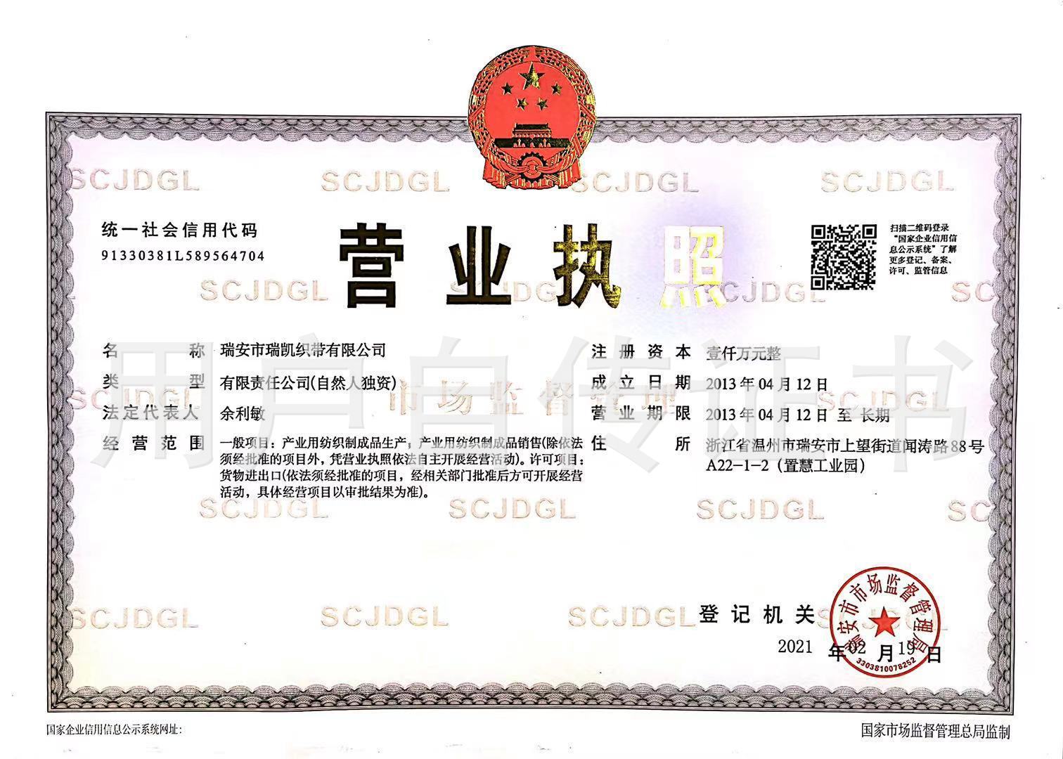 瑞安市瑞凯织带有限公司成立于2013年[前身为瑞安市瑞达织带厂]公司从小作坊发展到走马松紧带生产厂家之一【年生产0.3--1.5CM松紧带达一亿米以上】,现拥有织带机和普通机1000多台,在义乌和瑞安...