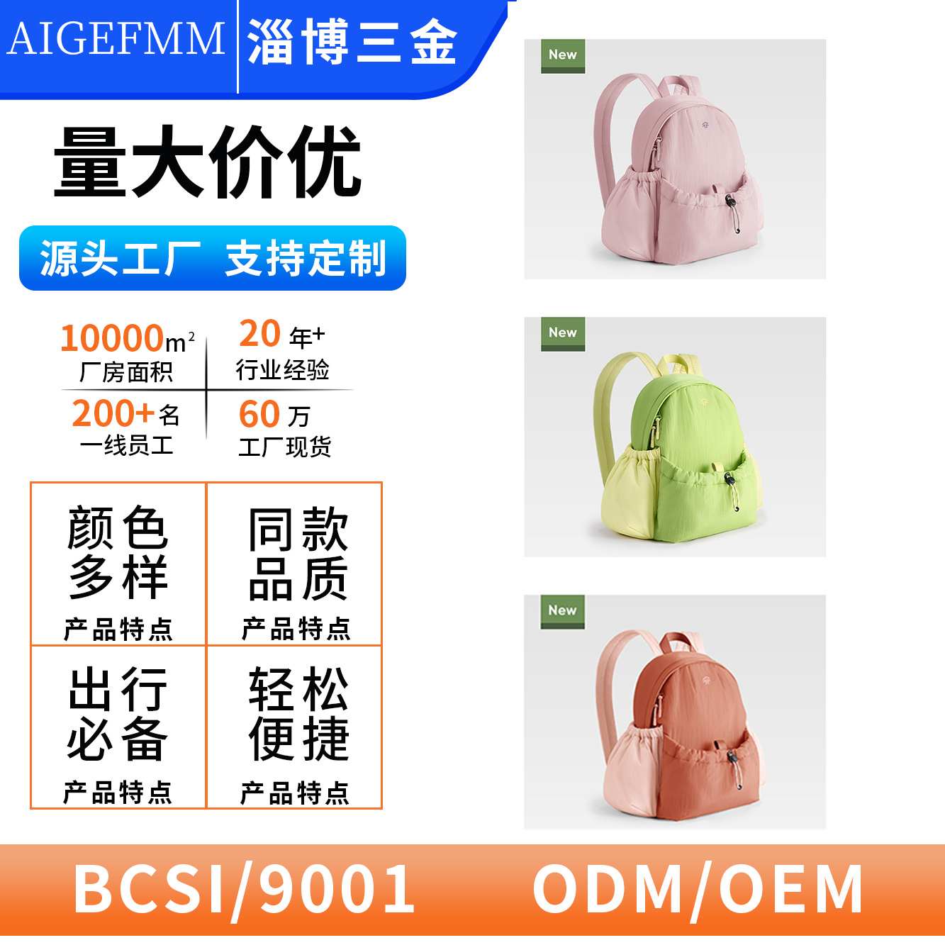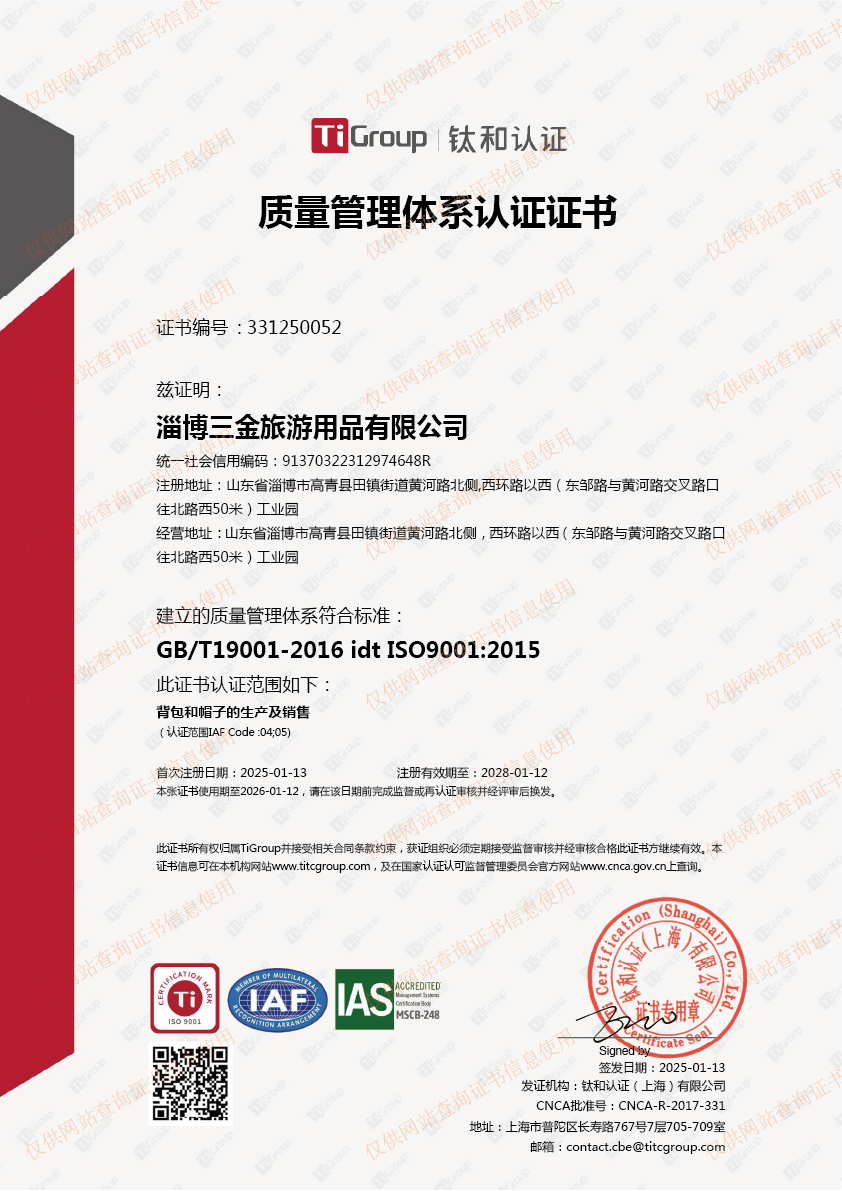淄博三金旅游用品有限公司是一家专业生产定制各类双肩背包、电脑商务包、运动版健身瑜伽包、各类广告促销包、学生背包、旅游包、旅游帽、学生帽、等产品专业生产加工的公司,拥有完整、科学的质量管理体系。专业为各...