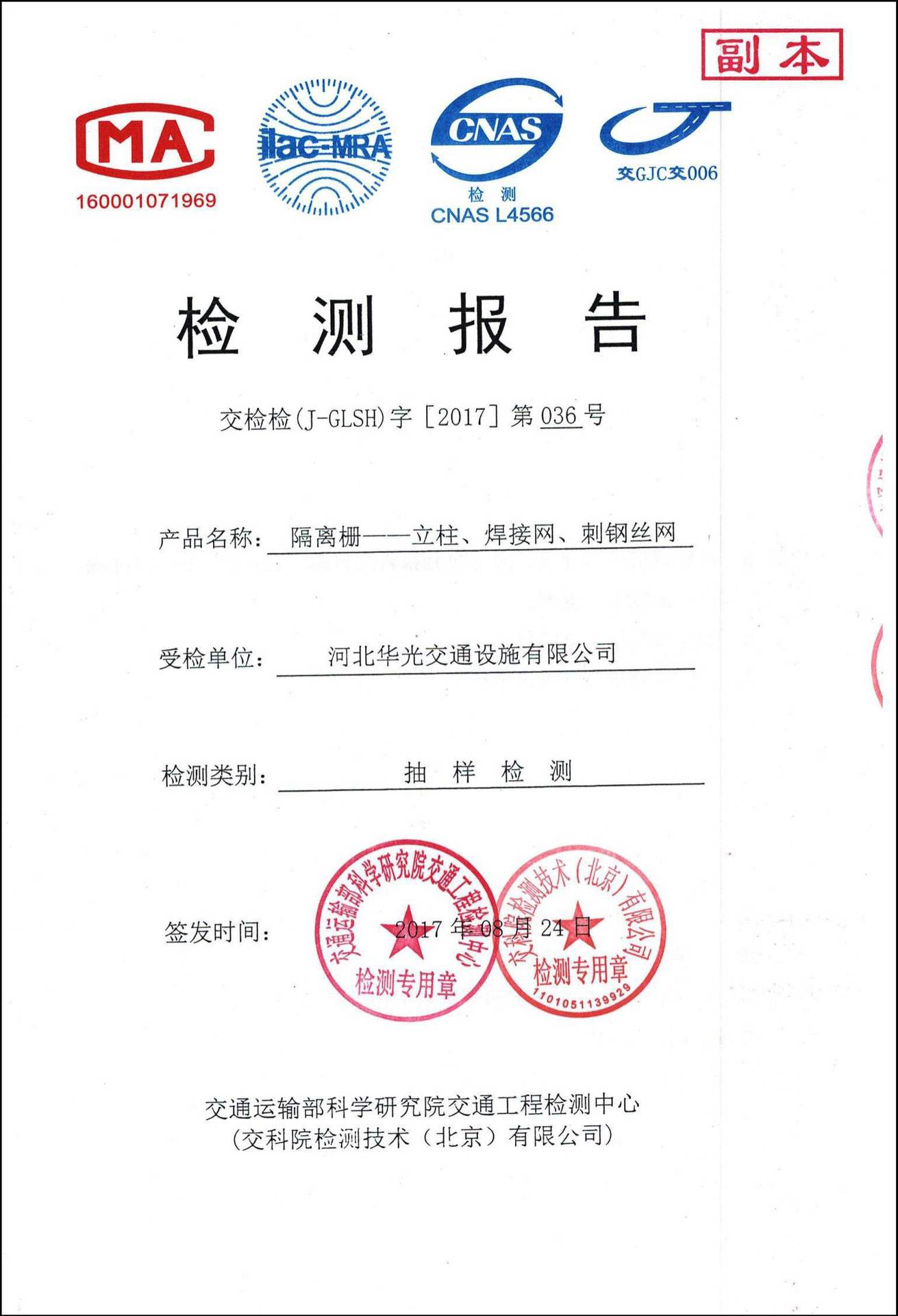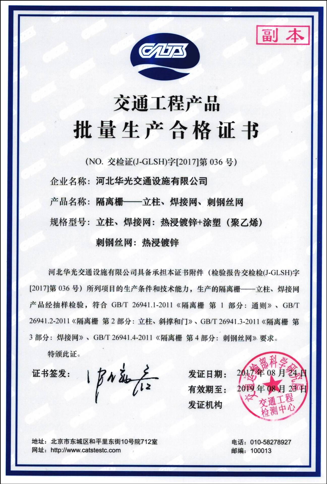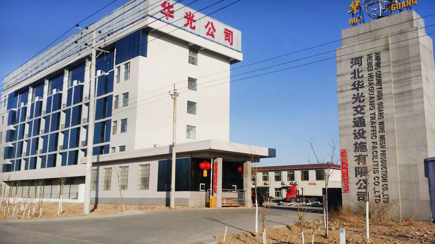 河北华光交通设施有限公司主要生产销售:护栏网,隔离栅,带肋钢筋网,土工布,土工格栅,刀片刺绳,公路标志,标线,护栏板,声屏障,石笼网,格宾网,水泥防护栅栏,钢板网,轧花网。
