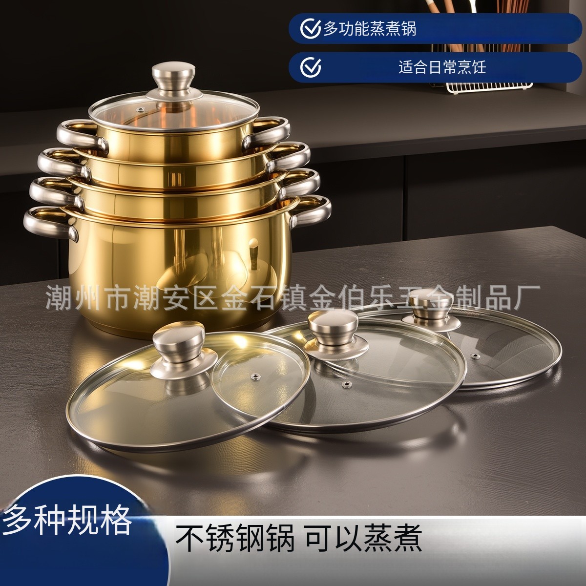 金伯乐五金制品厂 位于广东省潮州市潮安区金石镇一家已有30年生产经验的工厂,本厂生产各种不锈钢蒸锅 套装锅等等适用礼品渠道锅具,欢迎来电洽谈
