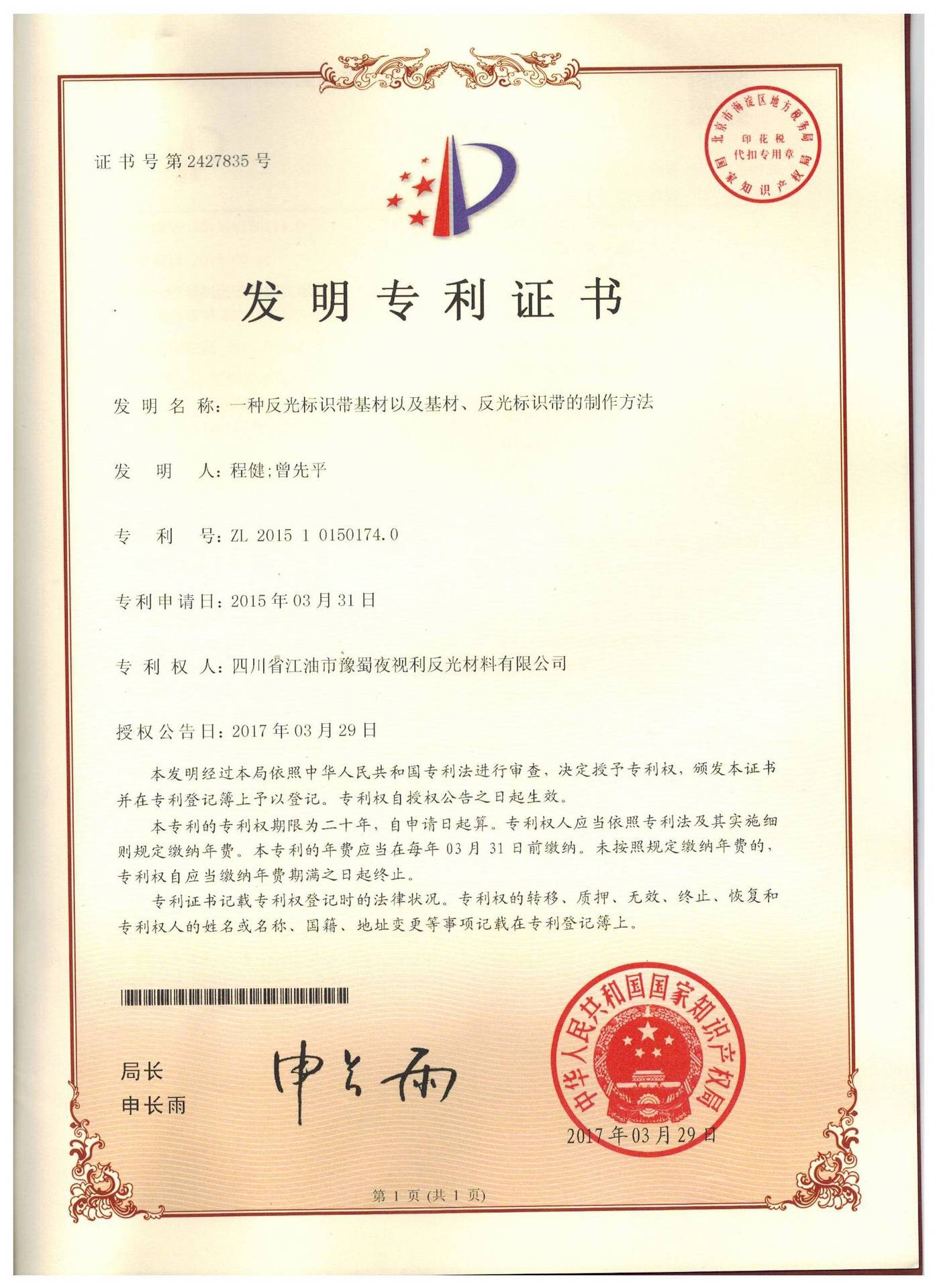 一种反光标识带基材以及基材、反光标识带的制作方法ZL 2015 1 0150174.0