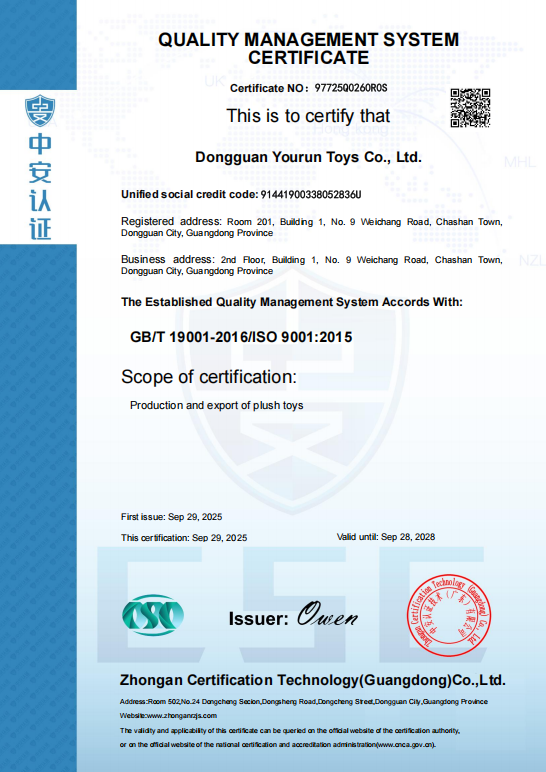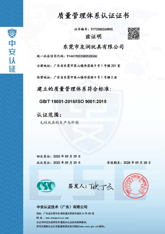 东莞市友润玩具有限公司是毛绒玩具生产、汽车饰品摆件、节庆活动礼品、家居饰品、幼教玩具等产品专业生产加工的公司,拥有完整、科学的质量管理体系。多年来专业从事毛绒玩具定制,东莞市友润玩具有限公司的诚信、实...
