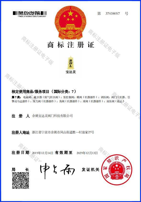 余姚宝达灵阀门科技有限公司在宁波市余姚市五金城附近、是中国著名的杨梅之乡、中国阀门生产基地。公司面积近1000平方米,专业制造生产、研发、销售、服务一体化,专注于各种电磁阀制造,燃烧机系列电磁阀,水用...