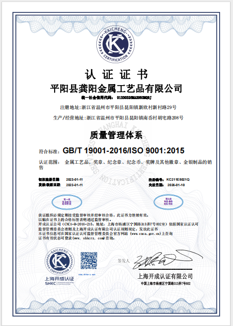 平阳县龚阳工艺品厂是奖牌、徽章、纪念章、纪念币、勋章、书签等产品专业生产加工的公司,拥有完整、科学的质量管理体系。平阳县龚阳工艺品厂的诚信、实力和产品质量获得业界的认可。欢迎各界朋友莅临参观、指导和业...