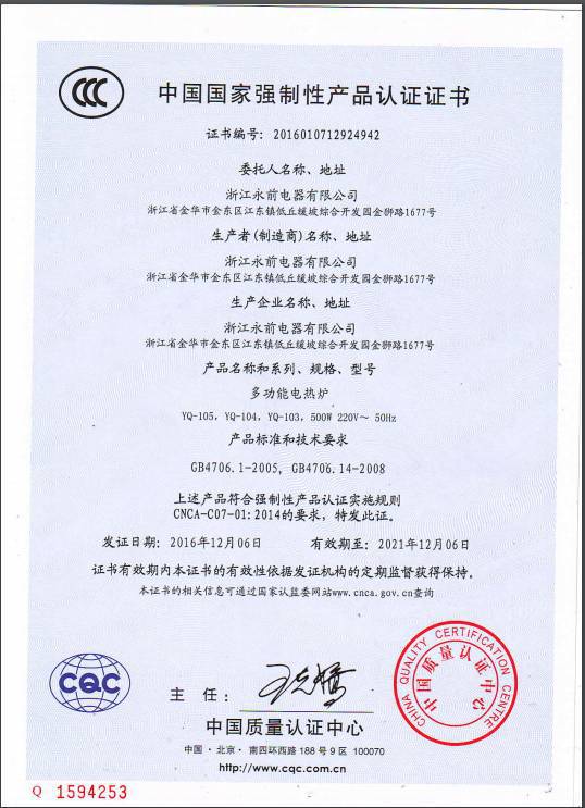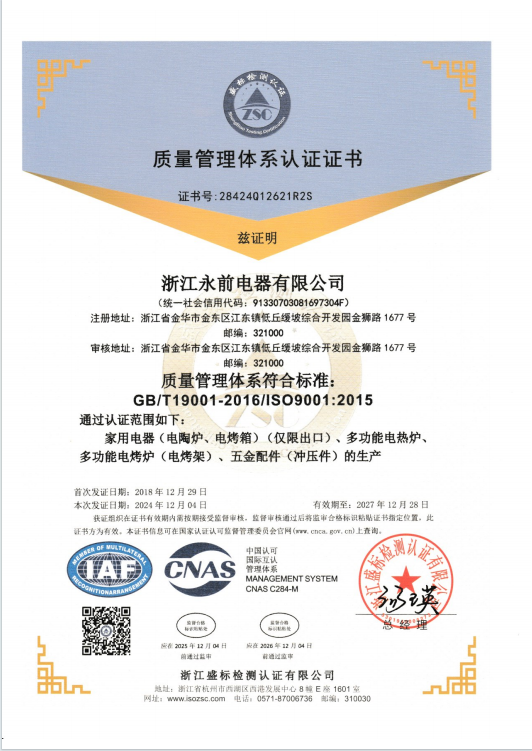 浙江永前电器有限公司成立于2013年11月,注册资本2500万元,前身是永康市永前工贸有限公司成立于2006年4月。是一家专门从事家用电器生产销售的公司。 本公司主要产品有:电陶炉、小茶炉、咖...