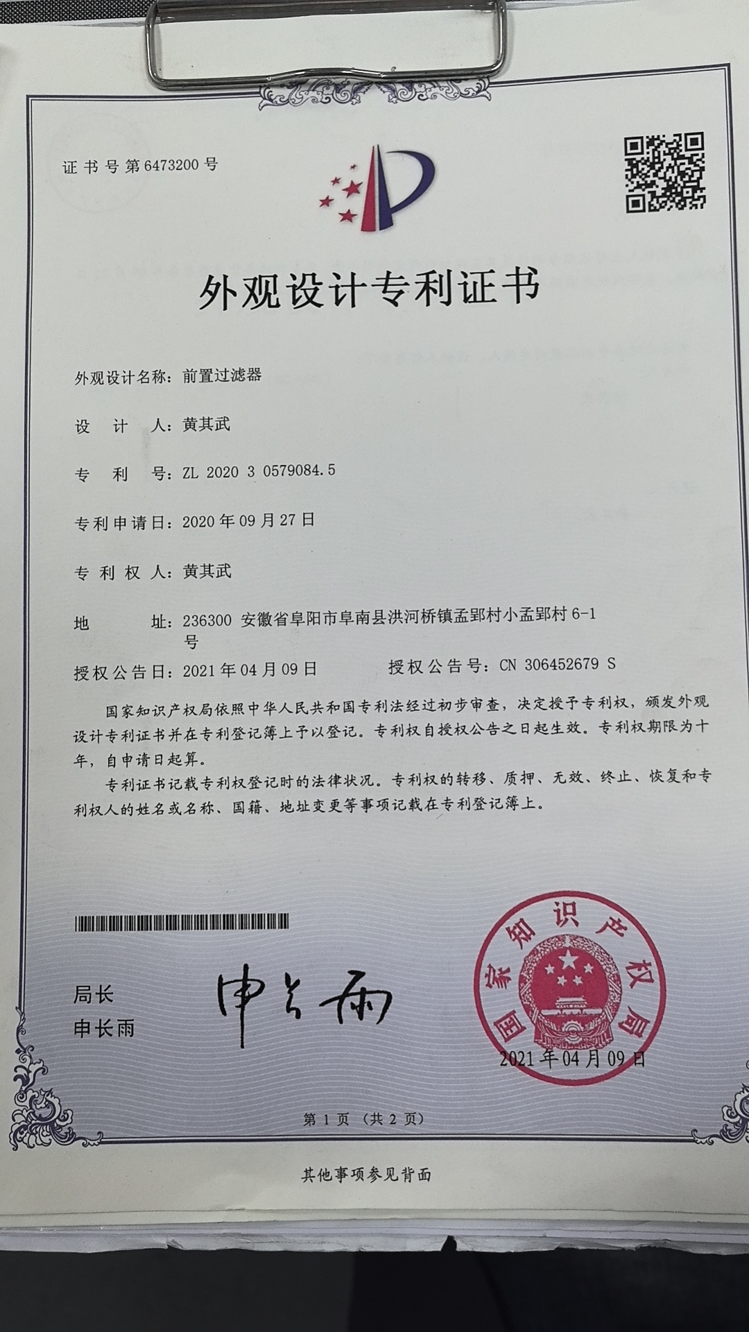 实用新型专利ZL202022251494.4