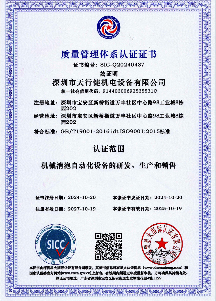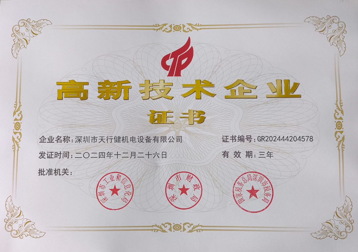 深圳市天行健机电设备有限公司成立于2009年8月。天行健机电是一家集设备研发、设计、生产、销售、服务为一体的高新技术企业。天行健机电已获得专利30余项,其集成电路1项,实用新型专利16项,软件著作权1...