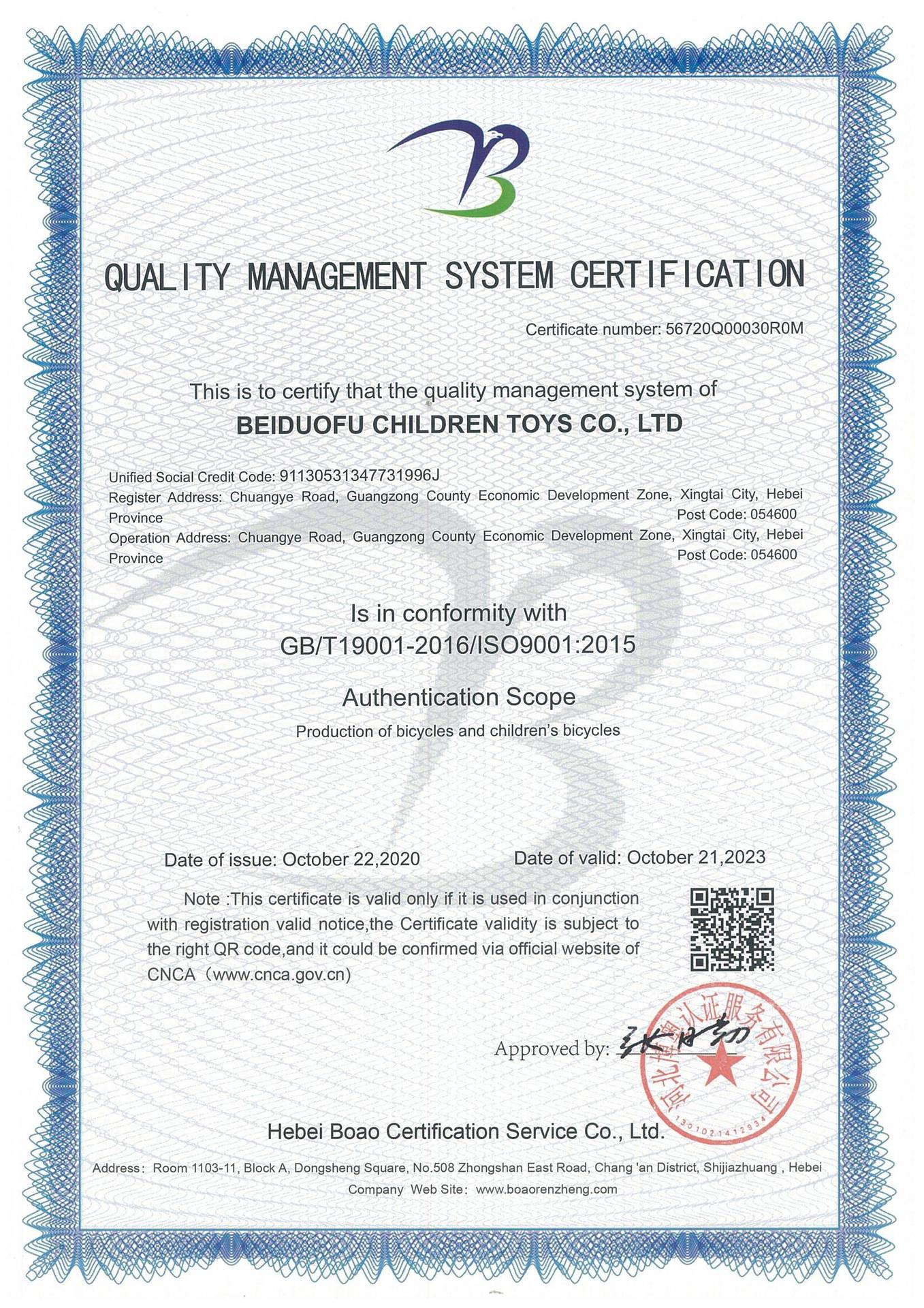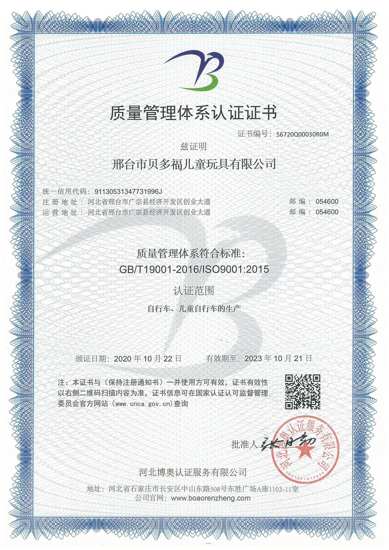河北贝多福儿童玩具有限公司,位于河北省邢台市广宗县经济开发区。公司占地面积逾35000平方米,企业员工上百人。拥有专业化生产厂房和生产设备,并拥有多年专业从事儿童自行车生产、管理、研发的团队。专业生产...