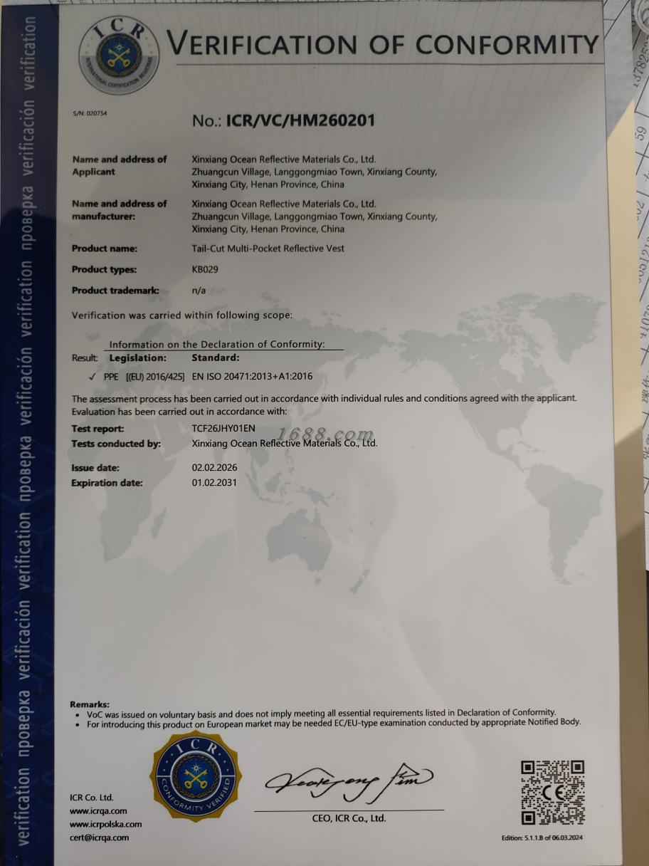 公司始于2006年,后更名为新乡市海洋反光材料有限公司,专业致力于反光背心、马甲的生产与销售。以诚信为本质量第一为原则,竭诚为您服务