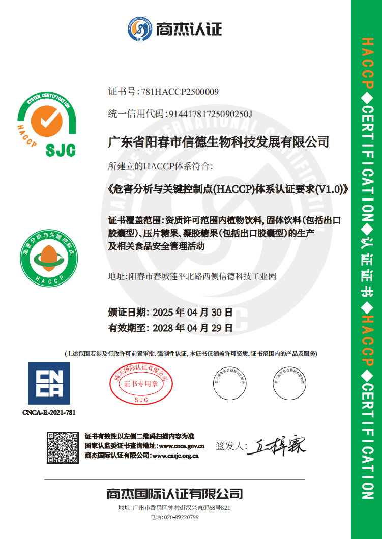 广东省阳春市信德生物科技发展有限公司是食品、保健食品生产、食品、保健食品OEM代加工等产品专业生产加工的公司,是广东省规模较大的集保健食品、药食同源食品研发生产及加工等为一体的综合性集团公司。