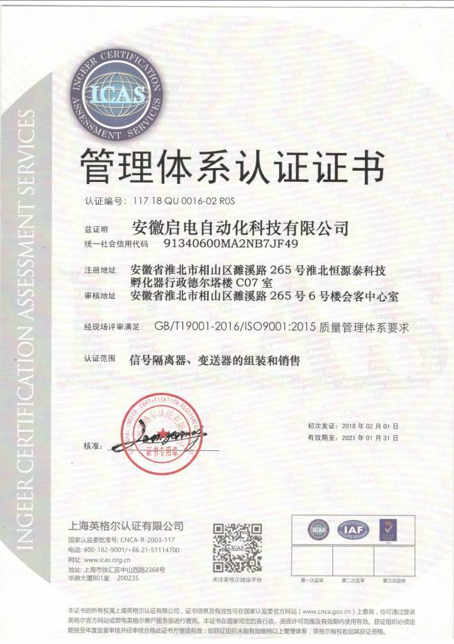 安徽启电自动化科技有限公司是一家从事工业现场信号隔离、转换变送等产品的研发、生产、销售的高科技企业。煦阳启电作为一家生产信号隔离器、隔离配电器、防爆防雷安全栅、电量变送器、压力、液位、温度变送器的制造...
