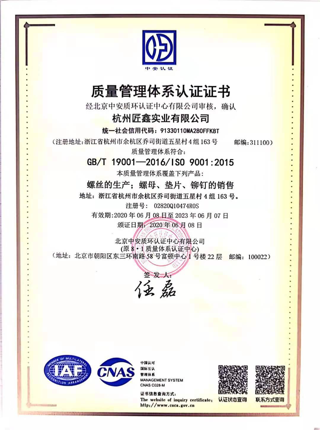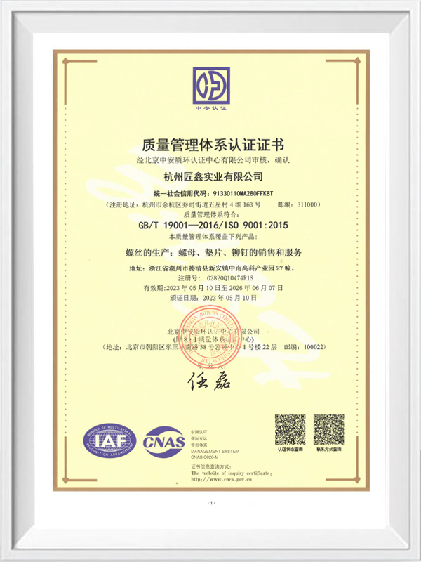 杭州匠鑫实业有限公司2016年成立,是一家集生产、研发、销售为一体的专业紧固件制造商,拥有先进水平的紧固件生产设备,运用先进的ERP系统进行管理。产品通过ISO9001国际质量管理体系认证,IATF1...