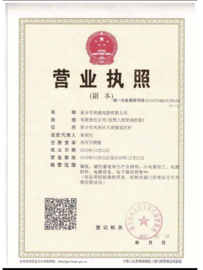 新乡市利威电源有限公司简介 公司成立于2016年12月22日,位于新乡市凤泉区大块镇原庄村工业区。 注册资金为300万元整,现有厂房办公场地近2000平方米,员工50-100多人。 主要经营镍氢...