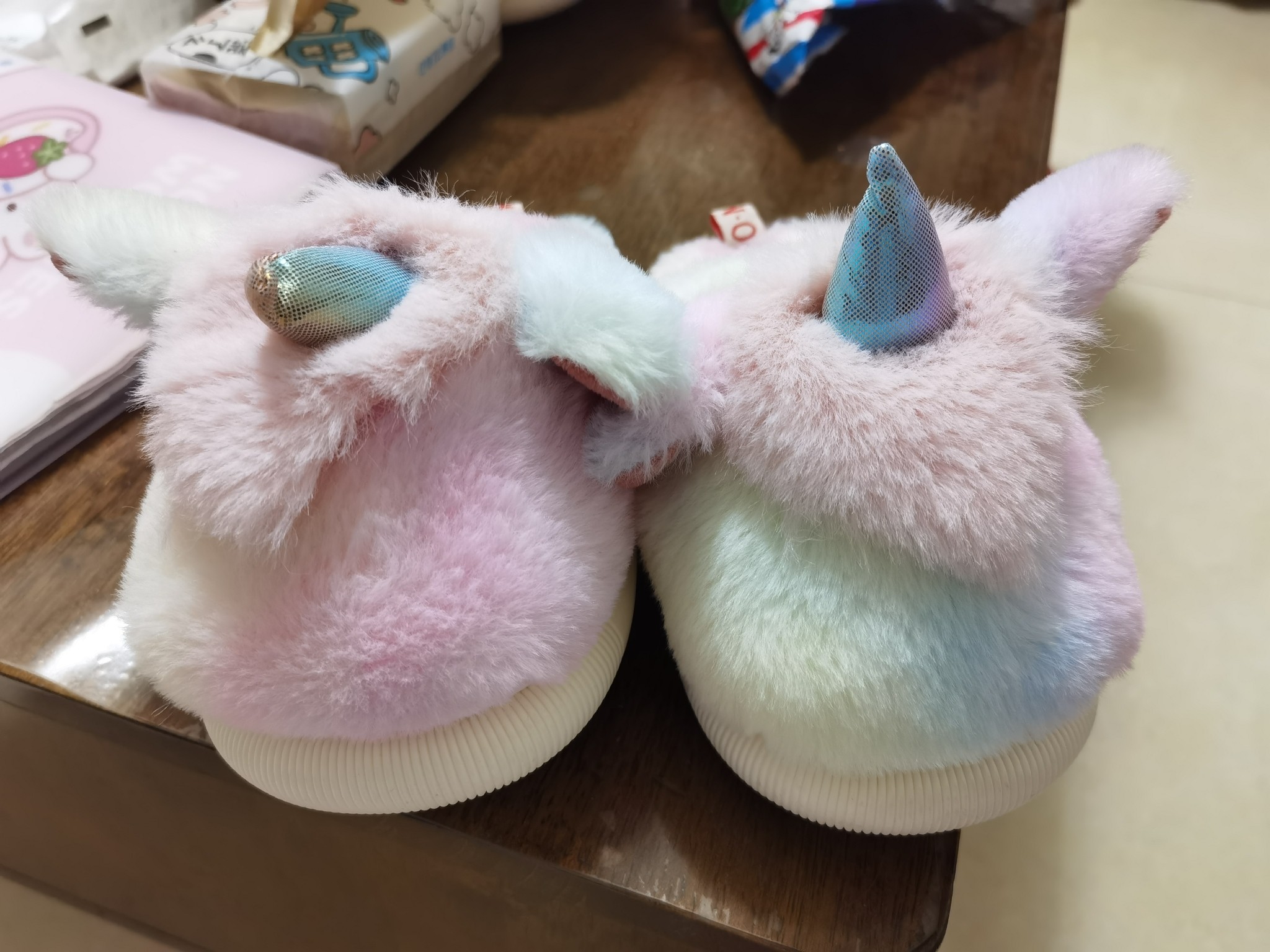 颜色很漂亮,但是不能啾那个毛,一揪就掉,我崽穿袜子是17厘米的脚,买的19的鞋,刚刚好,还可以买大一码,我崽还嫌小了。凉拖鞋不小,但是我觉得很硬,样子好看,质量还需要加强。价格比某宝便宜 2025.12.21