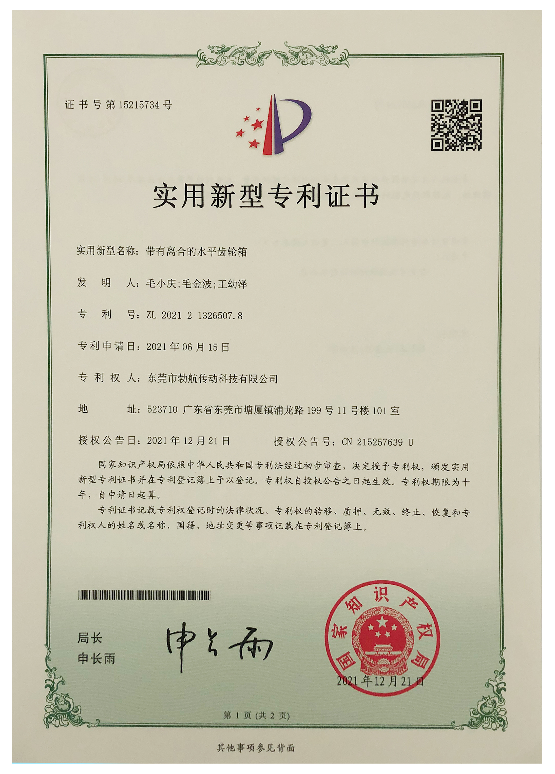 带有离合的水平齿轮箱CN215257639U