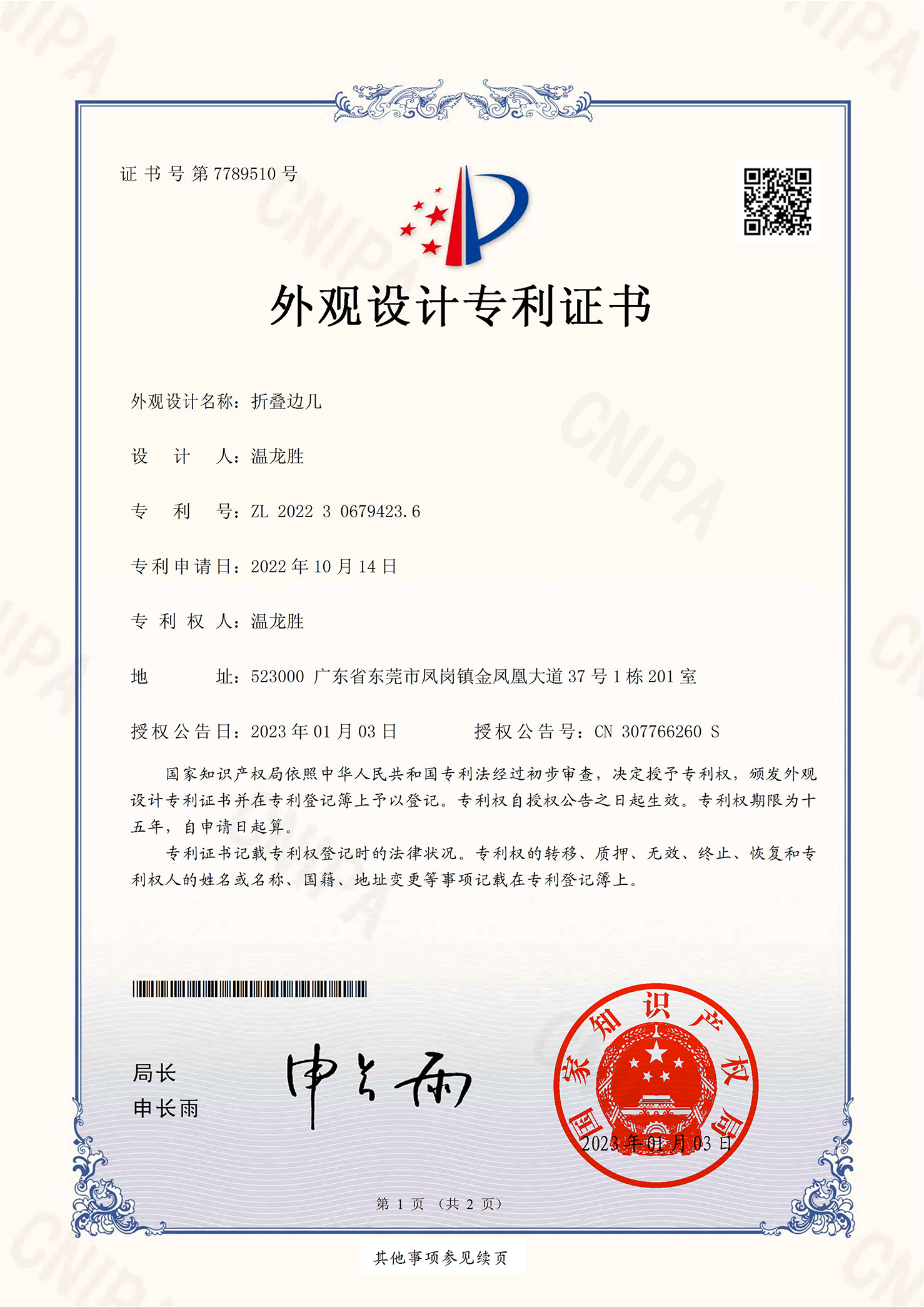 持有专利证书