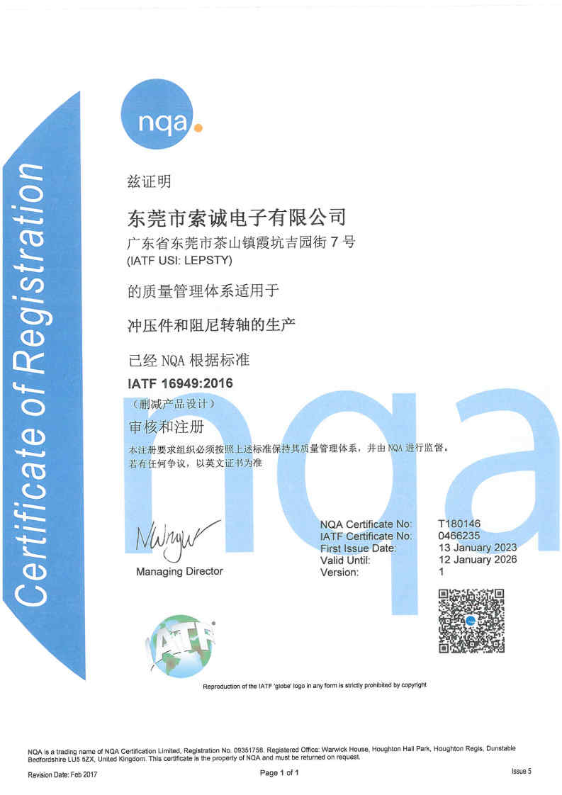 东莞市索诚电子有限公司是一家专注转轴定制、研发、生产的国家高新技术企业,位于广东省东莞市茶山古镇。 公司成立于2009年,占地面积10000平方米,职工近300人,其中技术人员20人,品质人员20人,...