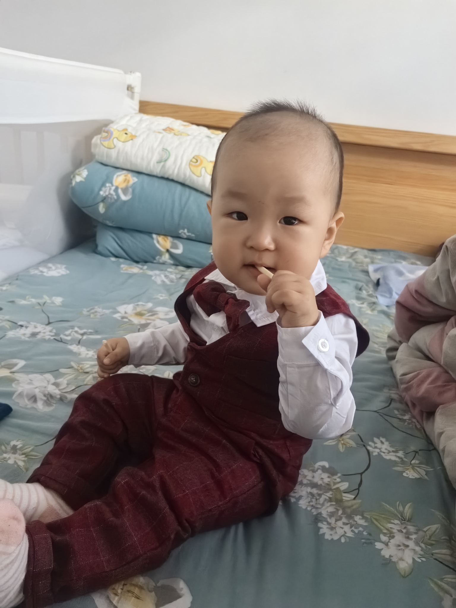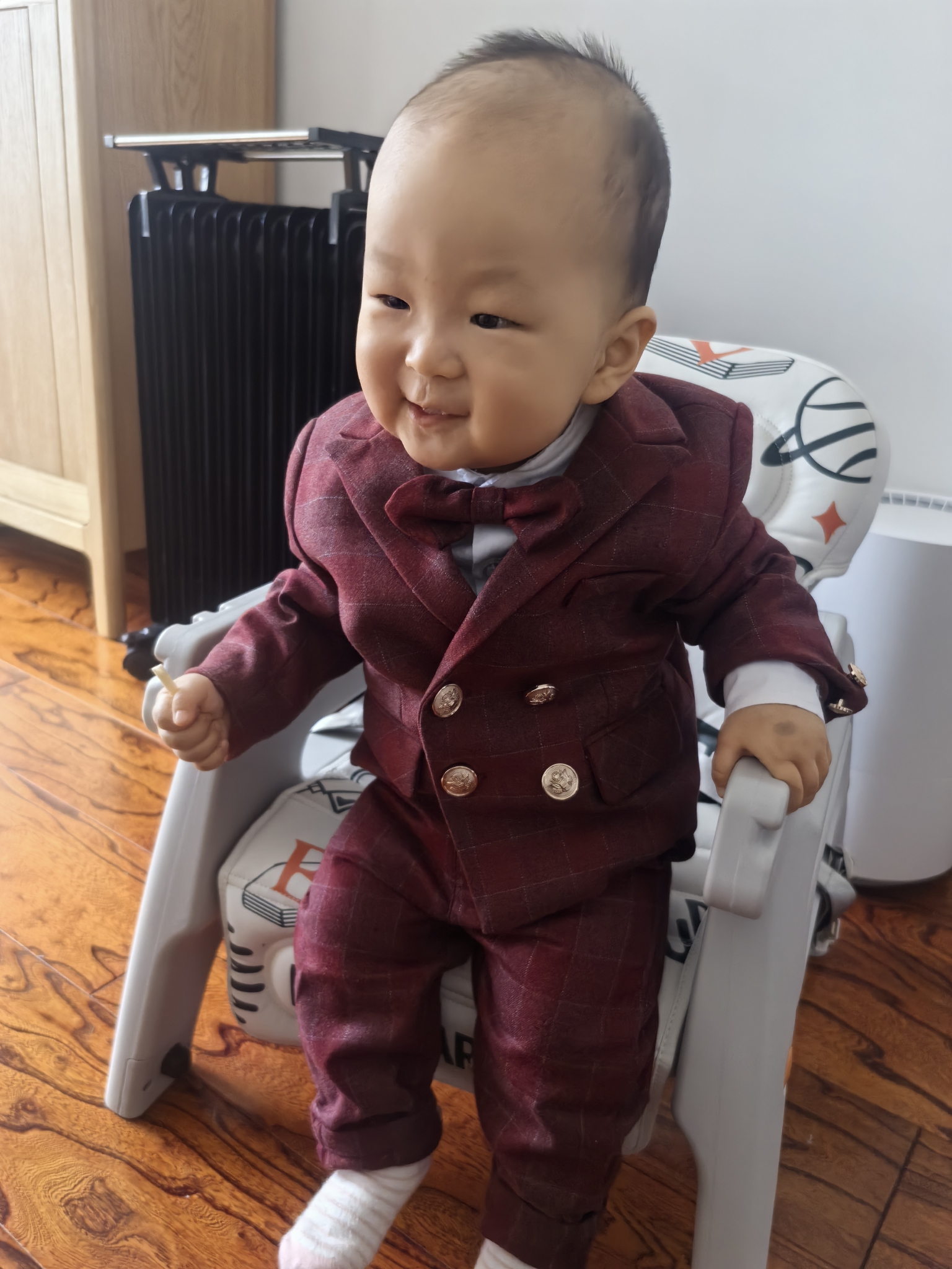 质量还不错,款式大方 总的来说,不错,衣服很有质感,很有型,买来周岁抓周穿。建议改进几个地方:小宝宝没有脖子,衬衣领子穿着不太合适;裤子对大屁股的的宝宝不友好;我家74.5cm,20斤,外套整体偏大,肩宽和袖长都大,其它都大小合适2024.2.28
