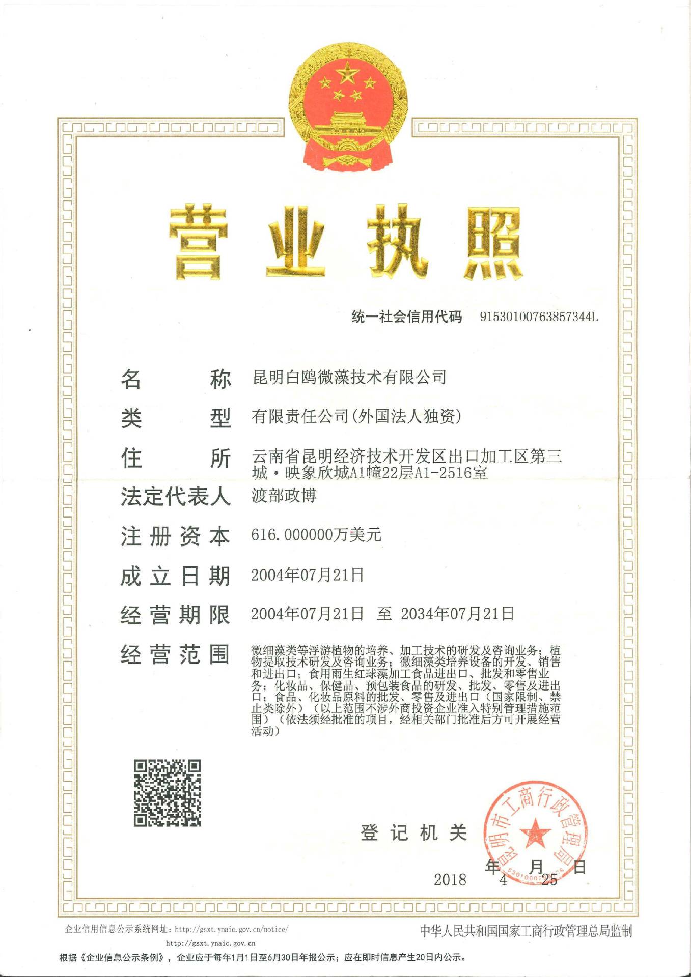 昆明白鸥微藻技术有限公司是由日本Biogenic公司于2004年6月在昆明经济技术开发区签订投资的,总额为6,160,000美金的外商投资企业。公司于2004年7月13日成立,并于2005年9月开始...