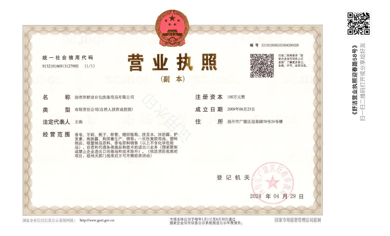 扬州市舒洁日化洗涤用品有限公司是香皂、牙刷、梳子、软管、缝纫拖鞋、洗发水、护发素、润肤露、剃须膏、一次性旅游用品、塑料制品、吸塑制品原料、香皂原料等产品专业生产加工的公司,拥有完整、科学的质量管理体系...