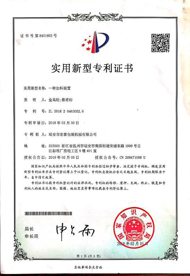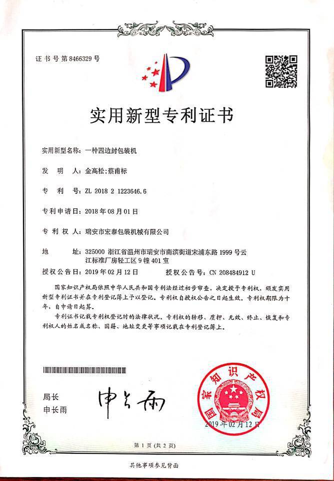 瑞安市宏泰机械科技有限公司是集科研、制造、销售、服务为一体的科研型民营企业,我公司技术力量雄厚,检测设备完善,以精心专业的品质,真诚的服务,深受国内外用户的好评.   我公司一直致力于包装...