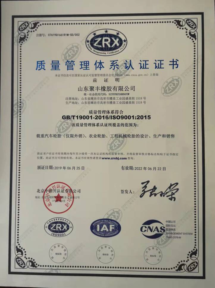 山东聚丰橡胶有限公司创建于1999年,现有职工近360人,占地面积70多亩,建筑面积2万多平方米,注册资金600万元,产值2.8亿元,公司引进先进的轮胎生产设备,并拥有完善的检测及原材料化验设备,主要...