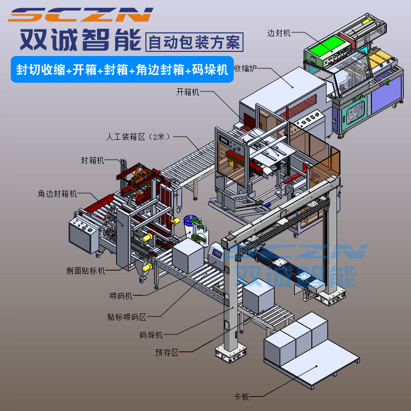 深圳双诚智能包装设备有限公司,专业生产包装设备和包装材料的厂家,公司成立于2005年,拥有5000平方的研发和生产车间。专业研发、设计以及生产包装设备。主要产品包括自动封箱打包系列、热收缩包装系列、真...