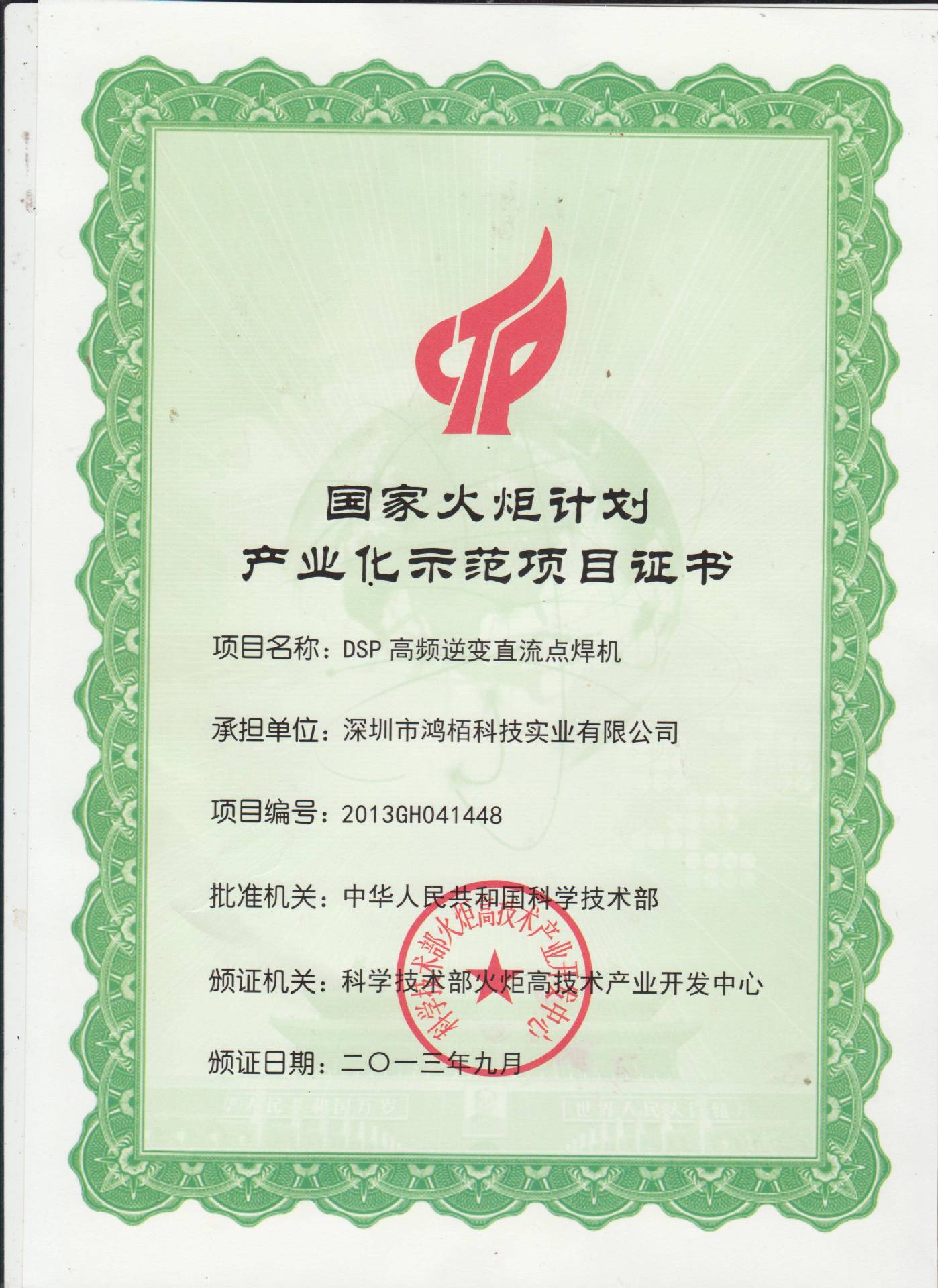 国家火炬计划产业化示范项目证书