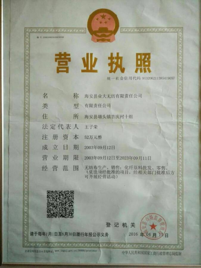 海安县业大无纺有限责任公司