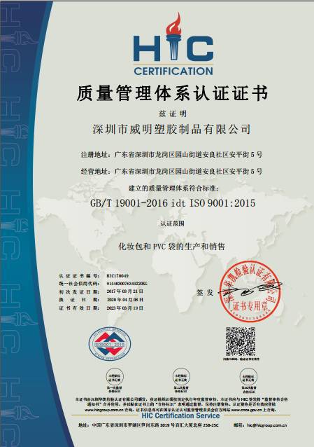 深圳市威明塑胶制品有限公司2004年成立于广东深圳,是一家专业定制生产包装袋的厂家,占地2000平方米,拥有员工200人,主要设备:电压设备42台,车缝设备60台。 公司主要生产PVC、EVA、TP...