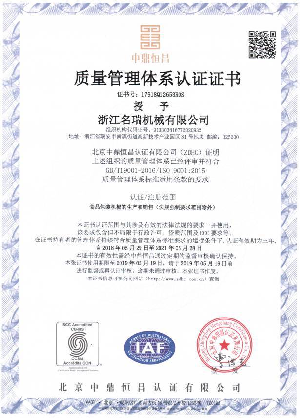 浙江名瑞机械有限公司创办于2008年,是一家集研发、制造、营销和服务为一体的机械制造企业,主要生产全自动给袋式(真空)包装机,产品填补了国内给袋式真空包装行业的空白,在国内属于给袋式真空包装机前沿企业...