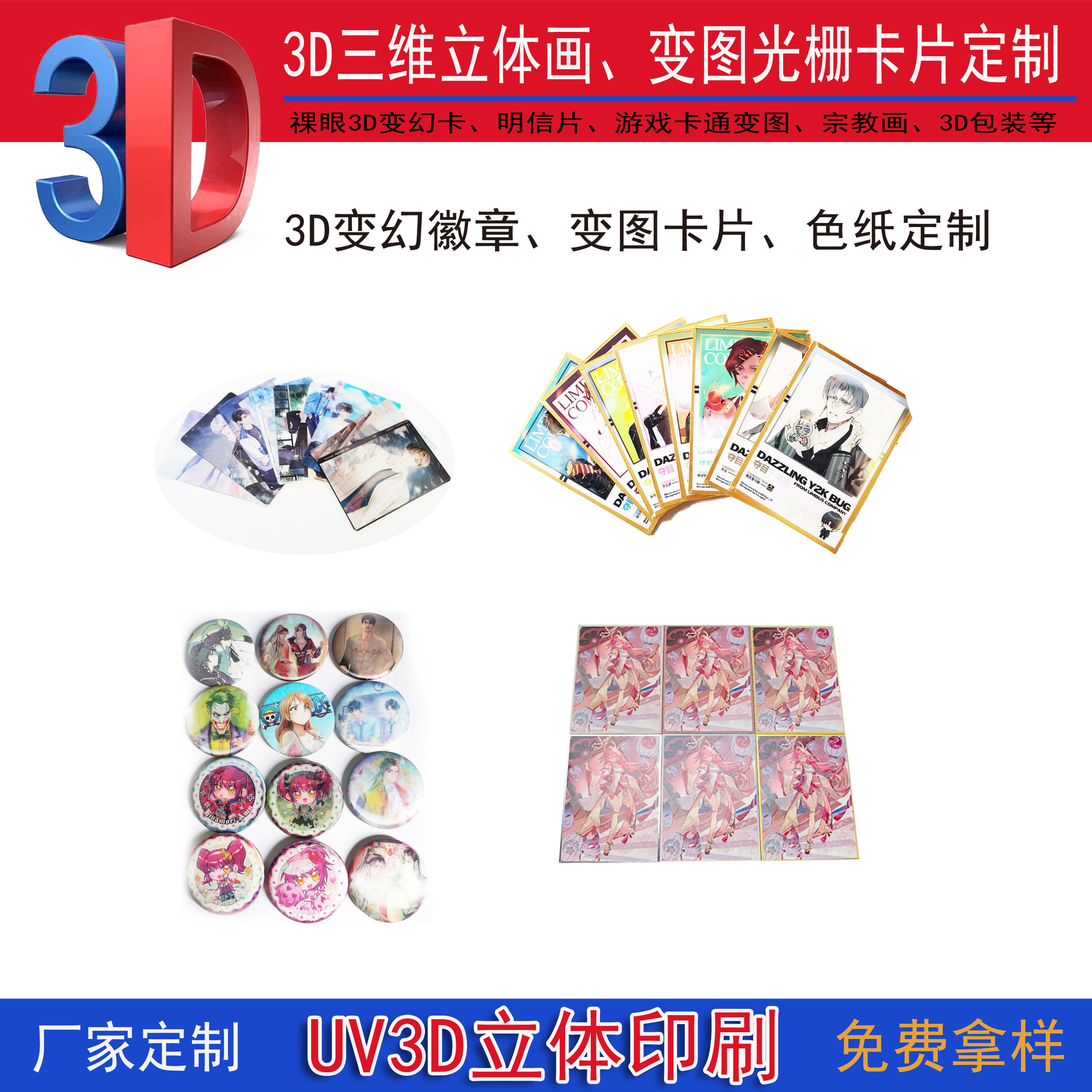 本厂专业生产定制3D光栅画、三维明信片、3D贺卡,马桶水箱3D片 、3D家具橱柜贴片、3D挂件、摆件、3D广告画、3D立体包装、卡片等3D立体UV印刷产品,从平面图,3D立体设计,出样,到出货一条龙服...