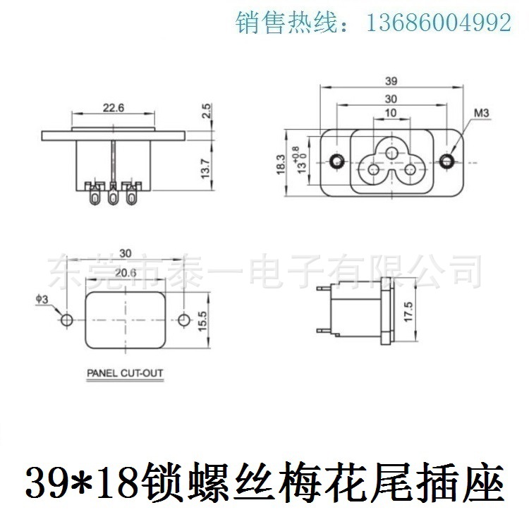 AC电源插座AC-08卡式3孔美式插座 3孔电源母座AC插座机箱机柜插座