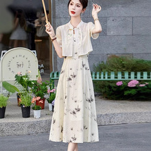 法式复古港风印花连衣裙女高级感荷叶边拼接不规则雪纺收腰长裙