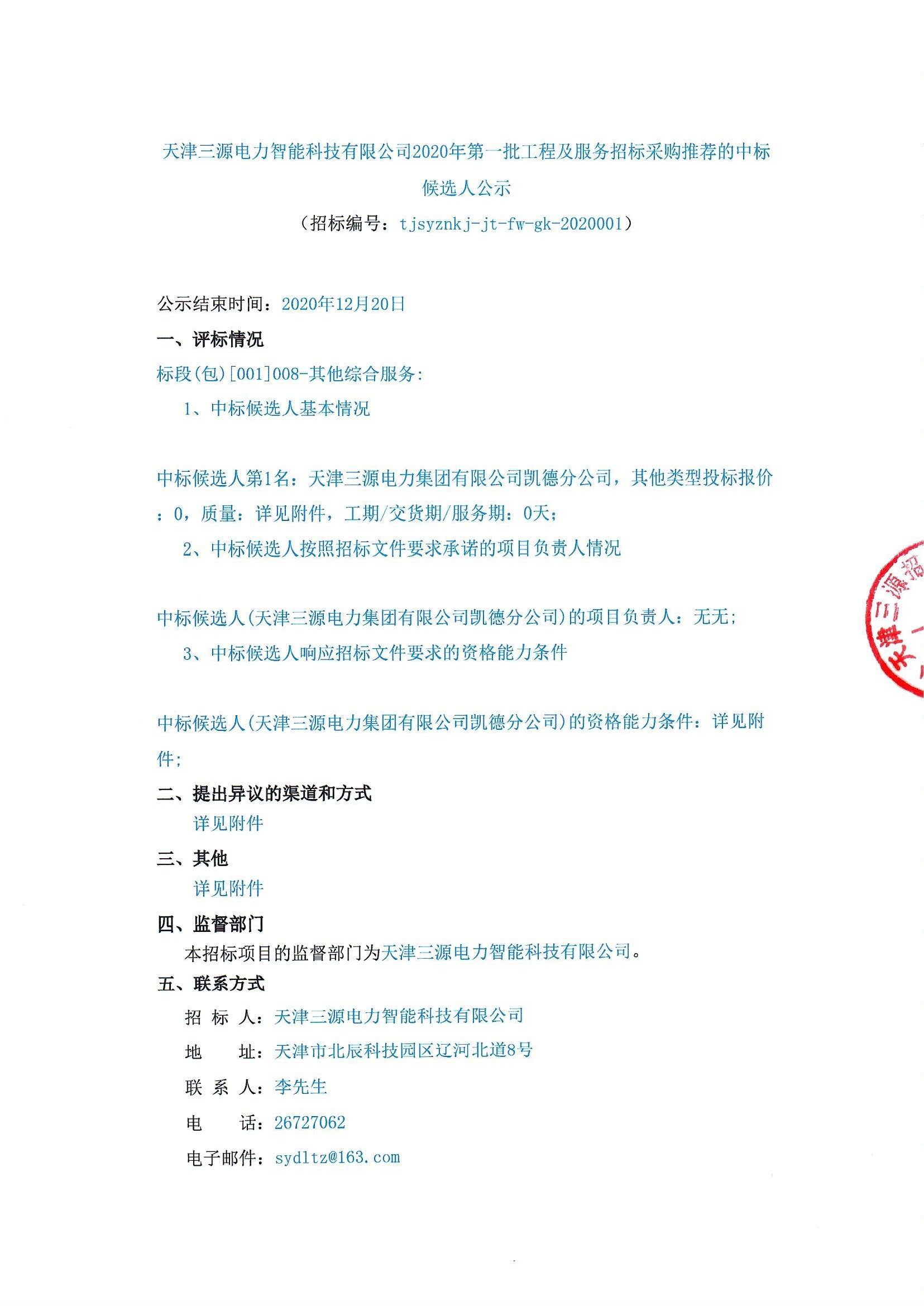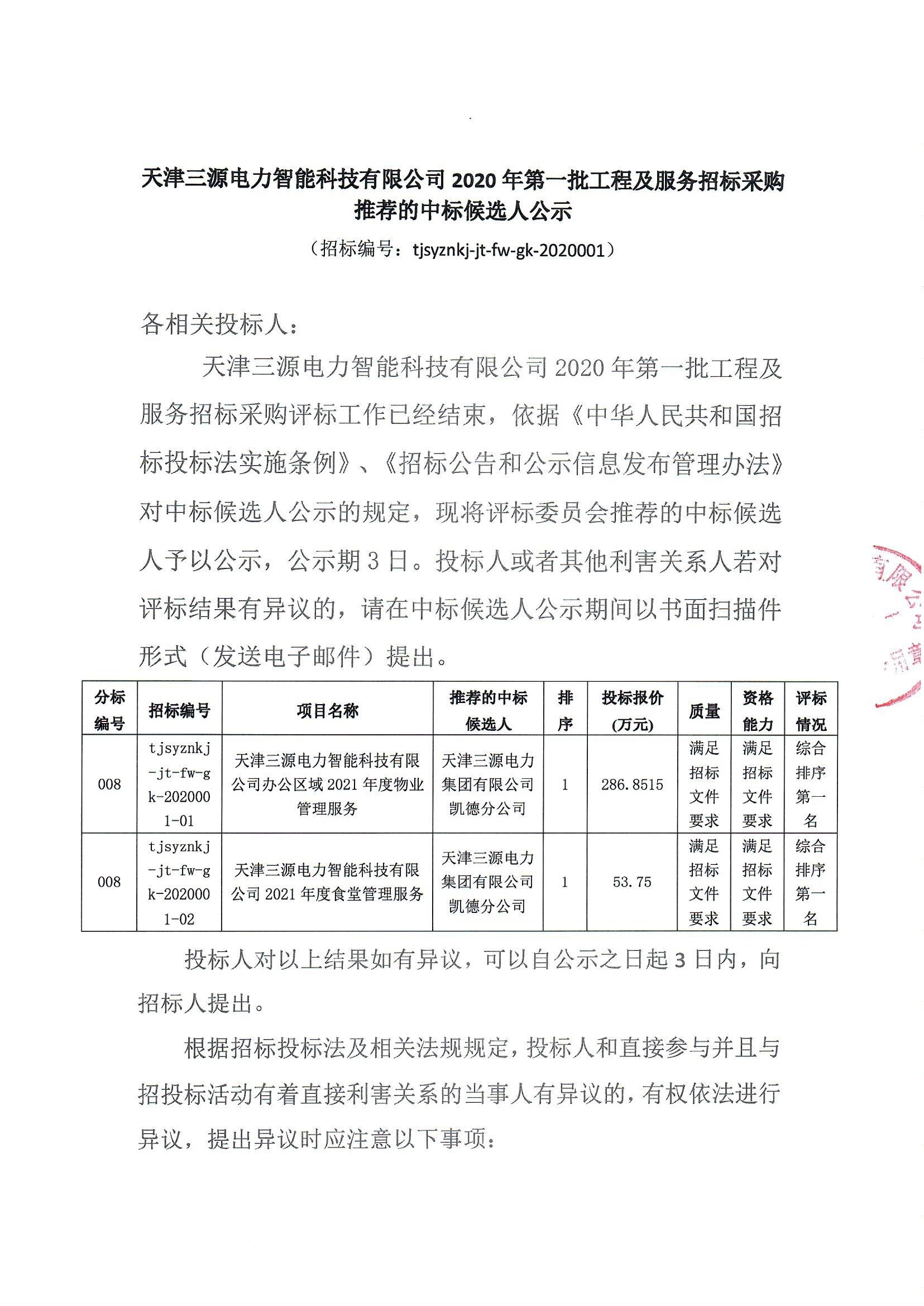 天津三源电力智能科技有限公司2020年第一批工程及服务招标采购推荐的中标 候选人公示 (招标编号: tjsyznk j-jt-fw-gk-2020001) 公示结束时间:2020年12月20日 评标情况 标段(包)[001]008-其他综合服务 1、中标候选人基本情况 中标候选人第1名:天津三源电力集团有限公司凯德分公司,其他类型投标报价 :0,质量:详见附件,工期/交货期/服务期:0天 2、中标候选人按照招标文件要求承诺的项目负责人情况 中标候选人(天津三源电力集团有限公司凯德分公司)的项目负责人:无无 3、中标候选人响应招标文件要求的资格能力条件 中标候选人(天津三源电力集团有限公司凯德分公司)的资格能力条件:详见附 件 、提出异议的渠道和方式 详见附件 其他 详见附件 四、监督部门 本招标项目的监督部门为天津三源电力智能科技有限公司。 五、联系方式 招标人:天津三源电力智能科技有限公司 地址:天津市北辰科技园区辽河北道8号 联系人:李先生 电话:26727062 电子邮件:sydltz@163.com招标代理机构:天津三源招标有限公司 地址:天津市东丽区华明高新技术产业区华裕路29号1号楼125-130室 联系人:金女士 电话:86259193 电子邮件:syzbykgc@126.com 招粉 斑 招标人或其招标代理机构主要负责人(项目负责人):3米(签名 告章意 招标人或其招标代理机构: (盖1天津三源电力智能科技有限公司2020年第一批工程及服务招标采购 推荐的中标候选人公示 招标编号: tjsyznkj-jt-「-gk-2020001) 各相关投标人: 天津三源电力智能科技有限公司2020年第一批工程及 服务招标采购评标工作已经结束,依据《中华人民共和国招 标投标法实施条例》、《招标公告和公示信息发布管理办法》 对中标候选人公示的规定,现将评标委员会推荐的中标候选 人予以公示,公示期3日。投标人或者其他利害关系人若对 评标结果有异议的,请在中标候选人公示期间以书面扫描件 形式(发送电子邮件)提出。 分标 推荐的中标排投标报价 资格评标 编号/招标编号 项目名称 质量 候选人 序(万元) 能力情况 tJsyznKJ 满足满足综合 天津三源电力智能科技有限天津三源电力 jt-fw-g 008 公司办公区域2021年度物业集团有限公司1286.8515招标招标排序 k-202000 文件文件第 管理服务 凯德分公司 1-01 要求要求名 t jsyznk j 满足满足综合 天津三源电力 jt-wg天津三源电力智能科技有限 008 集团有限公司1 招标招标|排序 53.75 k-20200公司2021年度食堂管理服务 文件文件第一 凯德分公司 1-02 要求要求名 投标人对以上结果如有异议,可以自公示之日起3日内,向 招标人提出 根据招标投标法及相关法规规定,投标人和直接参与并且与 招投标活动有着直接利害关系的当事人有异议的,有权依法进行 异议,提出异议时应注意以下事项1.异议必须在中标结果公示结束前以加盖公章扫描件发送 至异议联系邮箱的形式提出。 2.应当提交异议书,并包括下列内容: (1)异议人的名称、地址、联系人及有效联系方式; (2)被异议人的名称; (3)异议事项的基本事实; (4)有效线索和相关证明材料 3.异议人为法人的,异议书必须由法定代表人签字或者法 定代表人授权签字,同时还需提交营业执照副本复印件,所有材 料加盖公章;异议人为相关利害关系人的,异议书必须由异议人 本人签字,并附利害关系证明和身份证明,由本人提交。提供材 料不完整,异议诉求予以驳回。 4.下列异议将不予接收: (1)在中标结果公示结束后提出的; (2)异议人不能证明是所异议招标投标活动的投标人和直 接参与并且与招投标活动有着直接利害关系的当事人; (3)异议事项不具体,且未提供有效线索,难以查证的; (4)对异议事项已经答复,且异议人没有提出新的证据的。 5.异议人不得以异议为名排挤竞争对手,进行虚假、恶意 异议,阻碍招标投标活动的正常进行。 异议联系对象:天津三源电力智能科技有限公司 异议联系电话:26727166 二○二O年十二月十八日