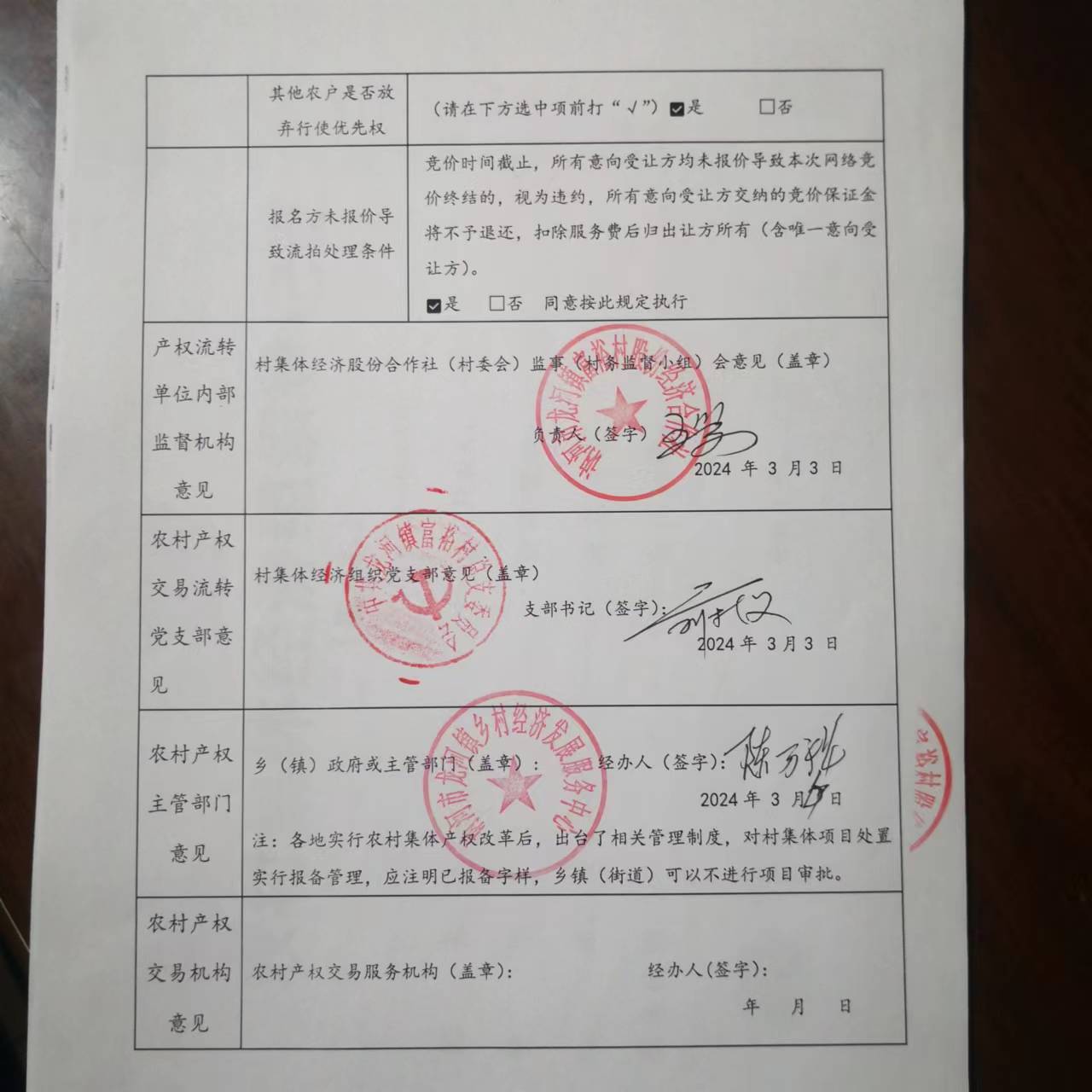 与转让相关的其他条件:1、交易机构工作人员:陈万祥,联系电话:13945255161。 2、受让方有意向应到标的物现场详细察看标的物的现状和瑕疵情况,对标的有明确的认识,若标的现状与项目公告内容有差异的,以标的现状为准,一经成交交易价格不作调整。3、第一轮仅限本集体经济组织成员竞拍,如有流拍第二轮面向社会竞拍。