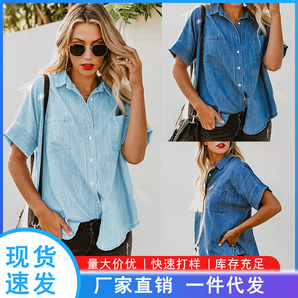 跨境新款水洗牛仔衬衫夹克2024欧美女秋冬个性街头风磨边下摆外套