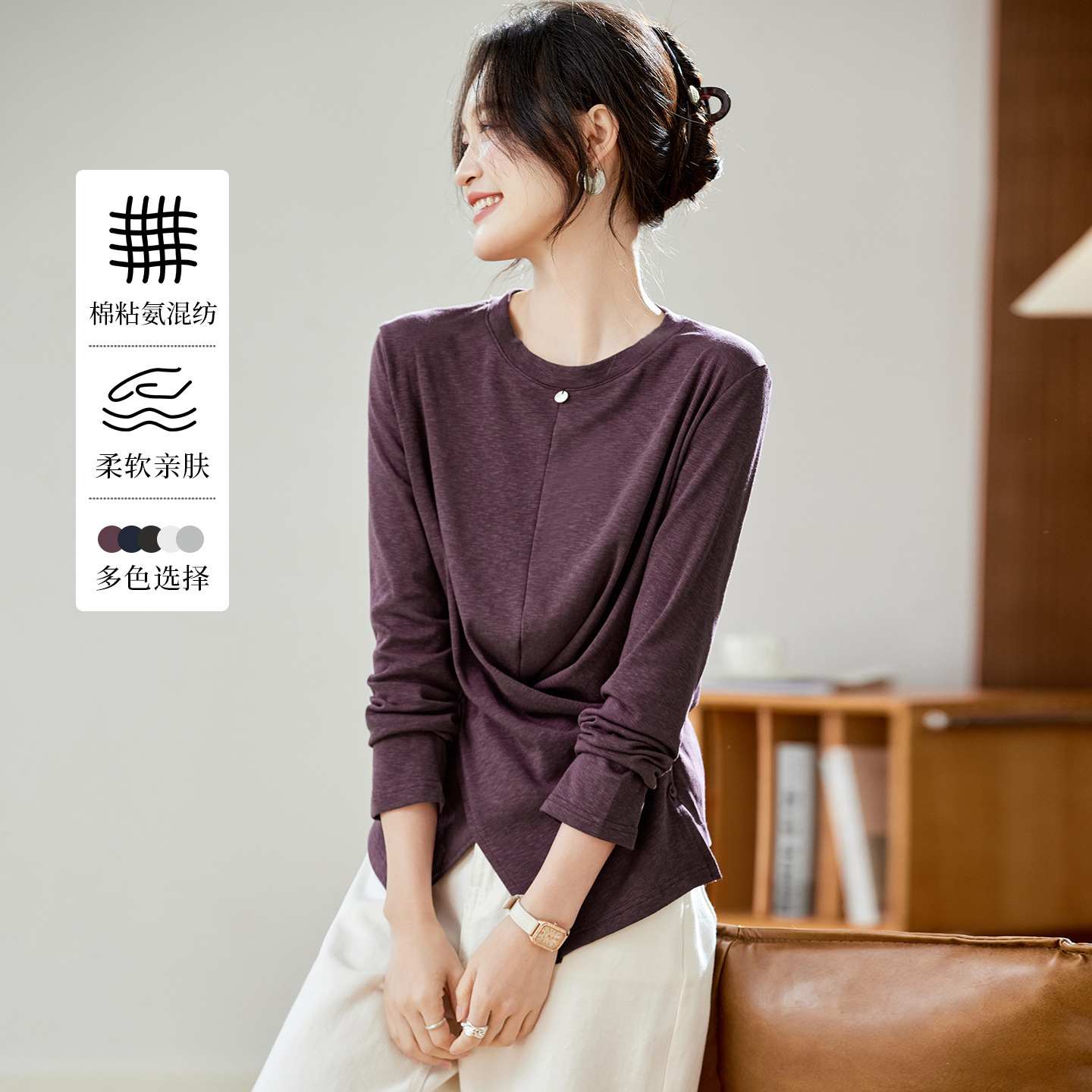 棉茧 紫色T恤衫女长袖2025秋冬装新款内搭上衣设计感不对称体恤