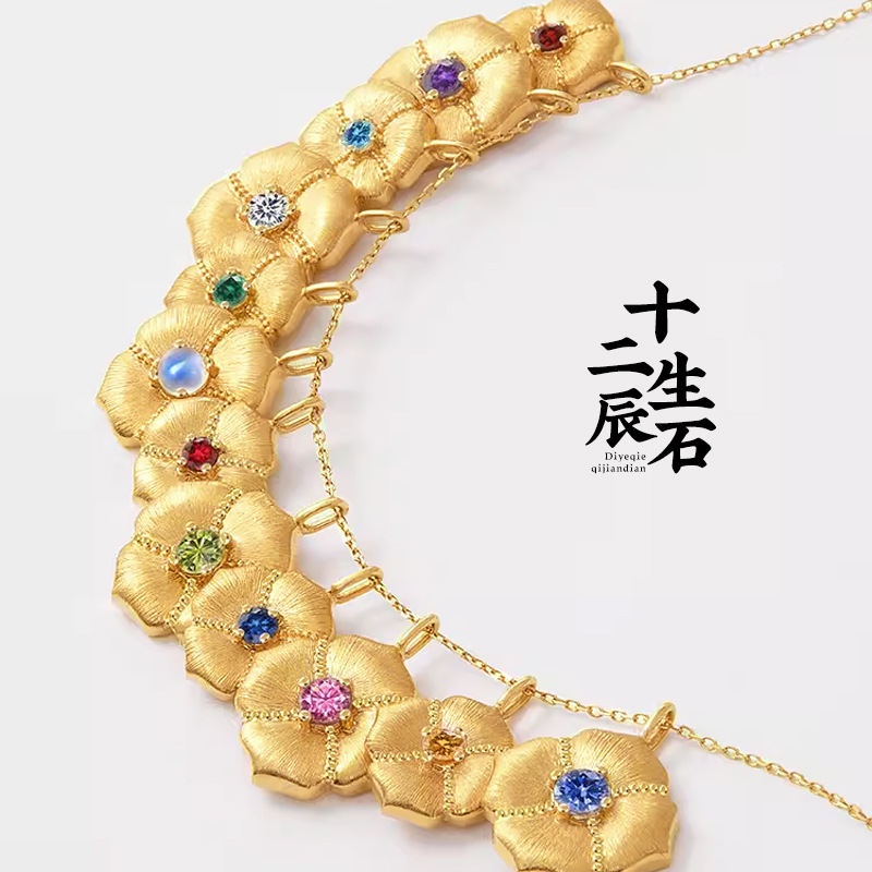 十二生辰石拉丝吊坠项链女镶嵌钻宝石国潮复古宫廷风锁骨链送礼